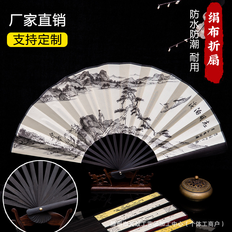 中国古風男性折扇観光地区の人気工芸品男性扇絹布扇子山水画10インチ彫刻ロゴ