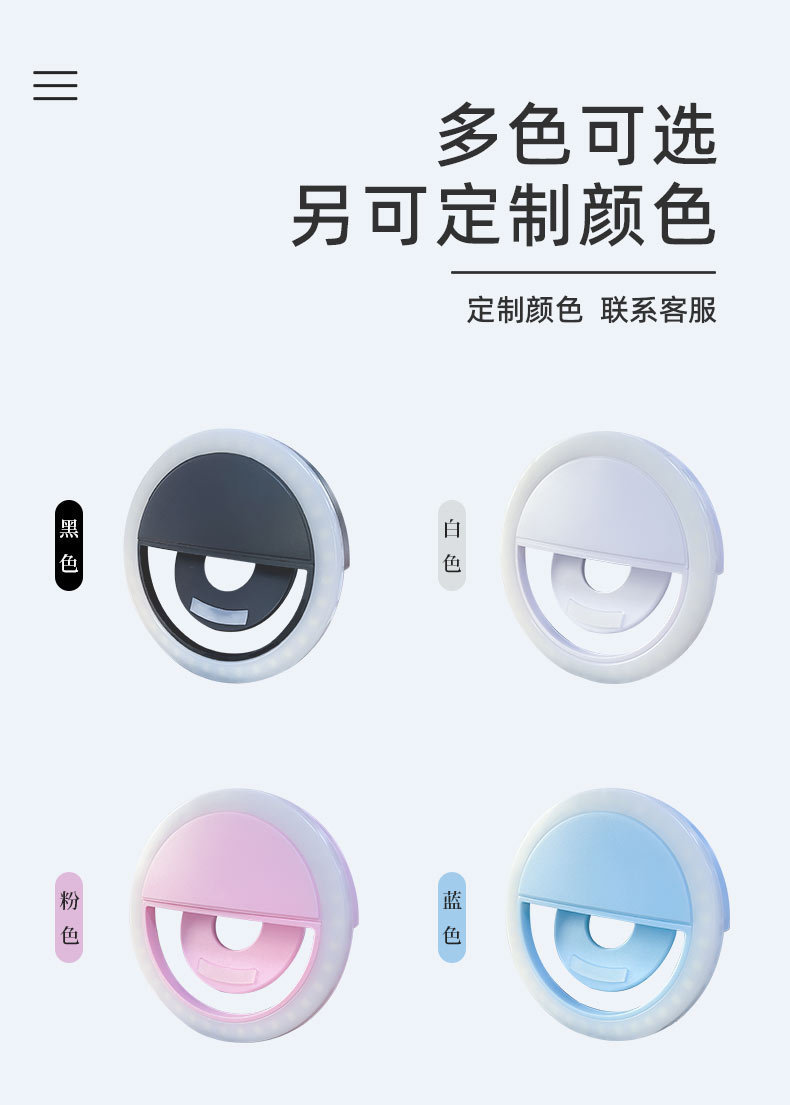 产品特点:小巧便携,3档调节亮度适合不同环境风格!礼品定制logo,持续续航一小时补光,户外直播拍照优选补光灯!夹子设计,硅胶垫片,多角度多方位使用!源头工厂大量现货,支持定制!欢迎新老客户下单!