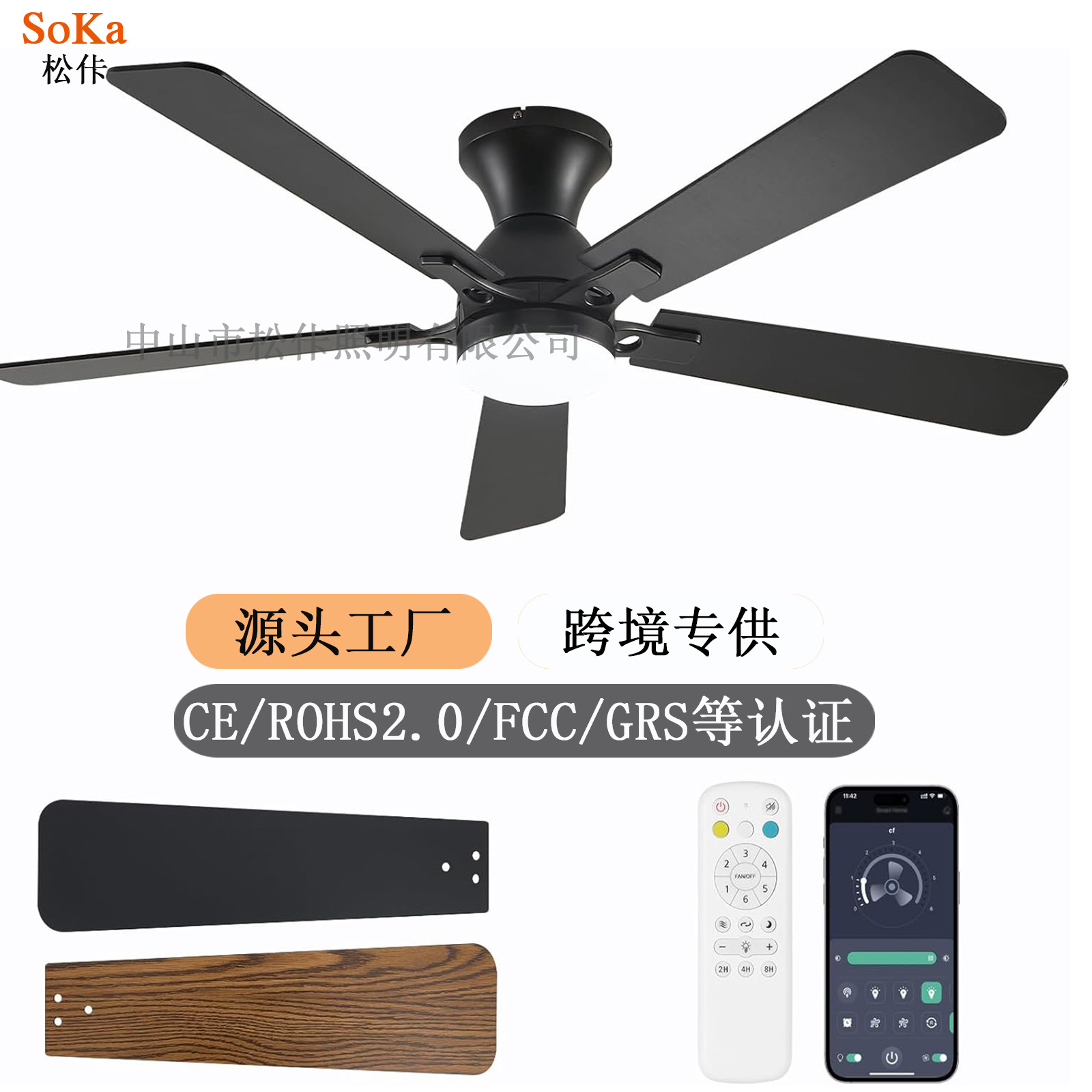 亚马逊热销跨境吊扇灯52寸5叶吸顶风扇灯三色无极调光遥控APP控制