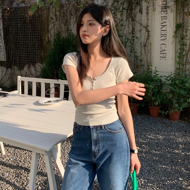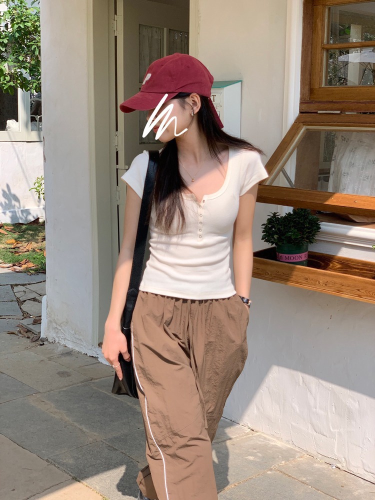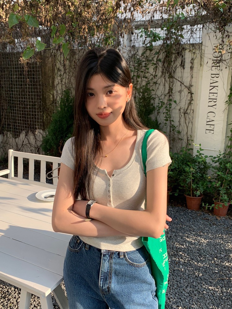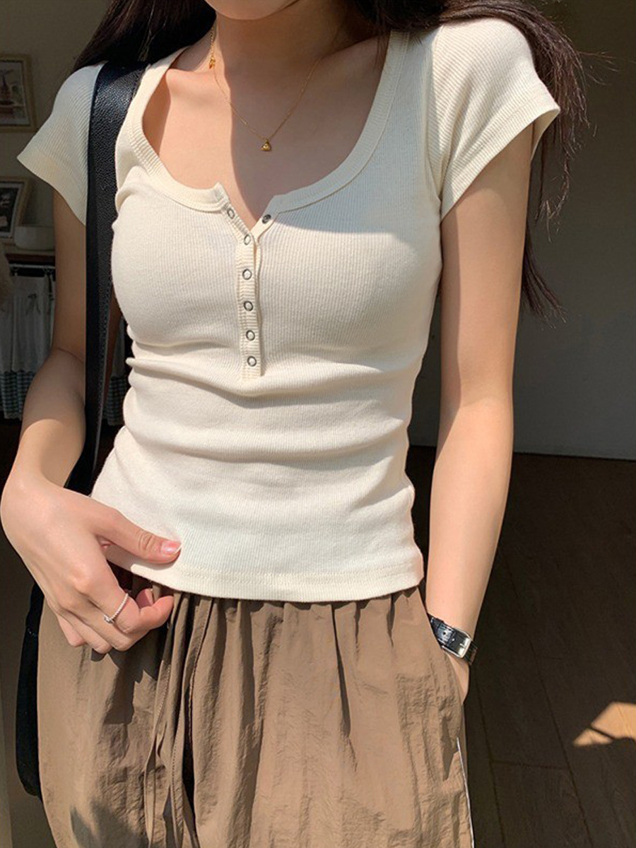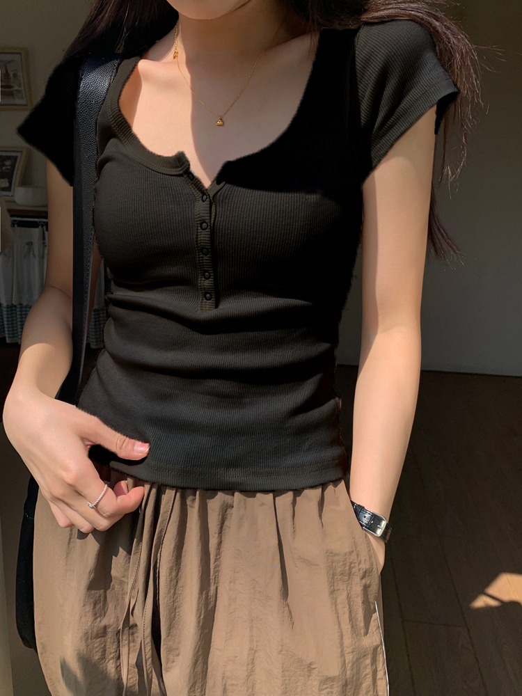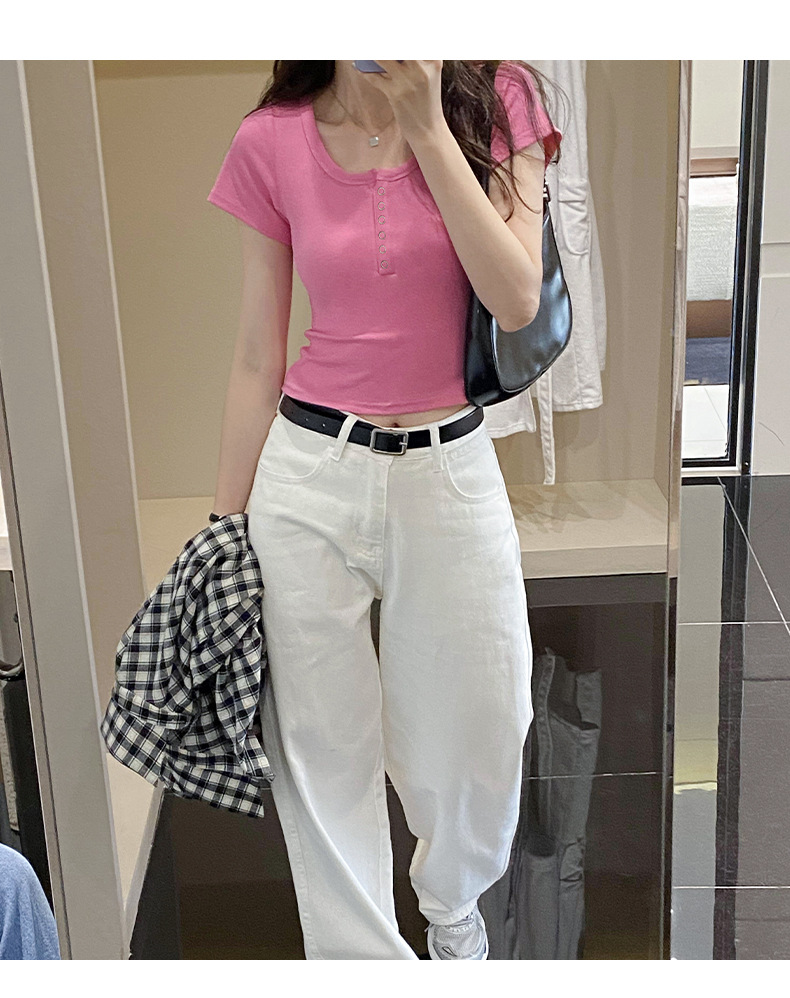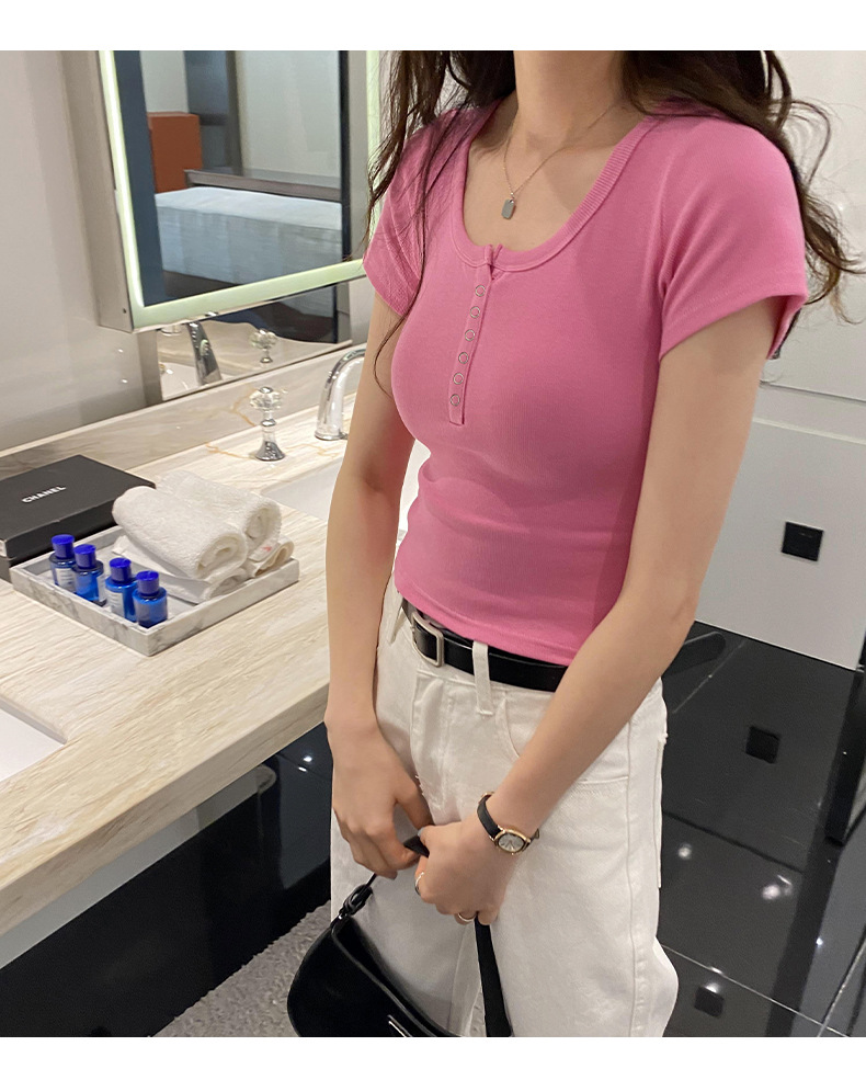 綿のボタンのtシャツの女性の半袖の2024夏の新型の方襟の百合の外は身を修めることができてやせている上着の底のシャツを現します。