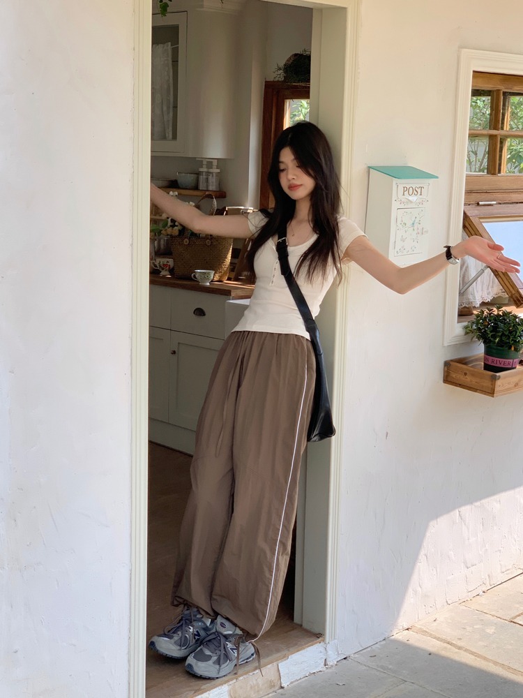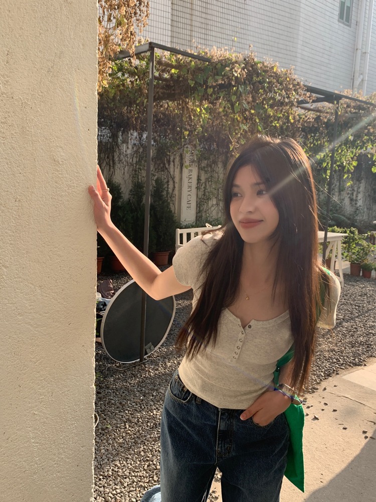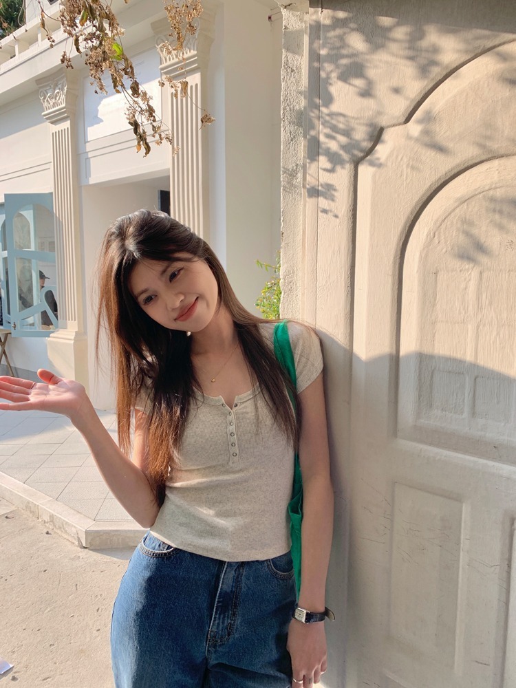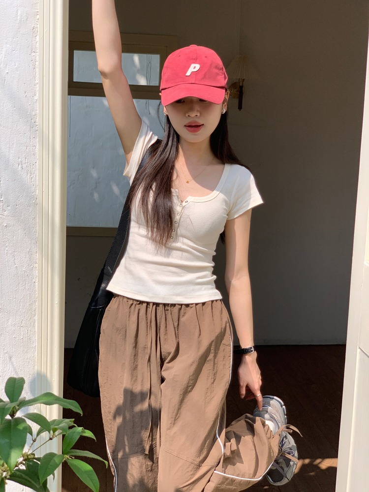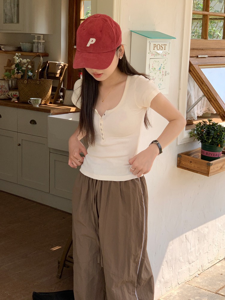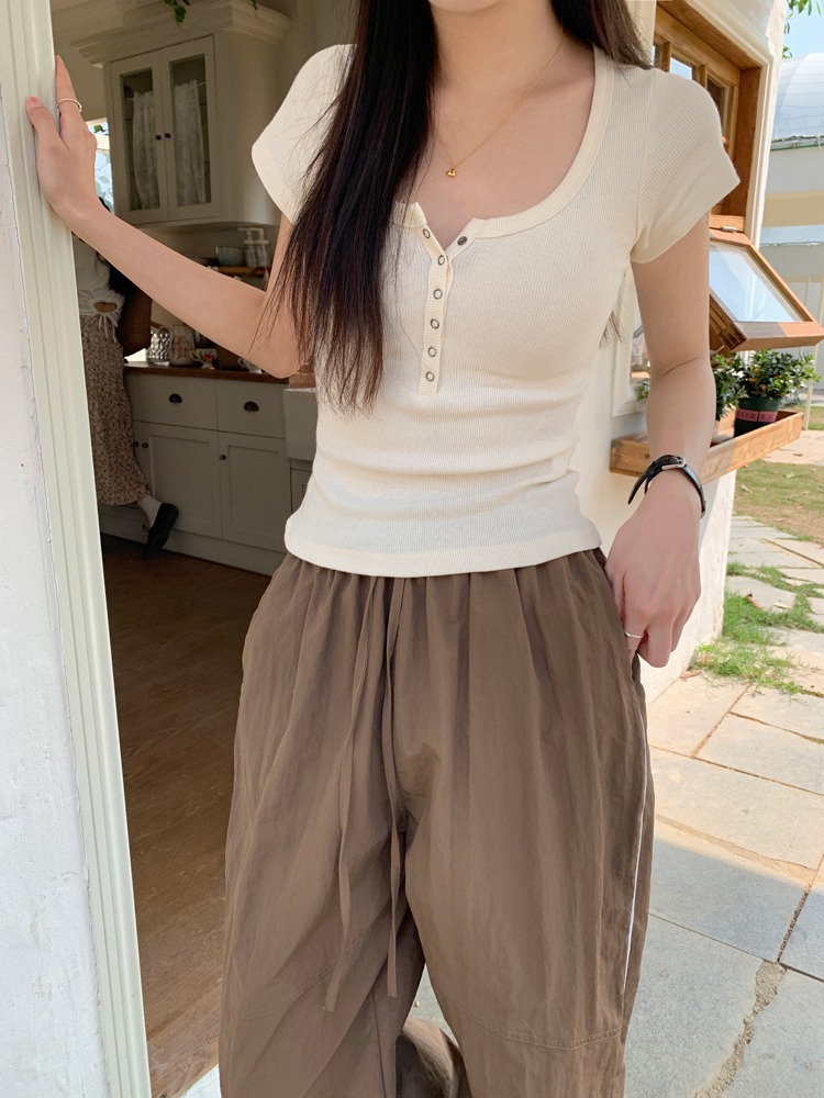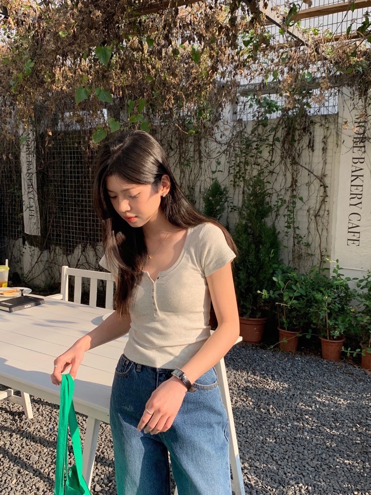 綿のボタンのtシャツの女性の半袖の2024夏の新型の方襟の百合の外は身を修めることができてやせている上着の底のシャツを現します。