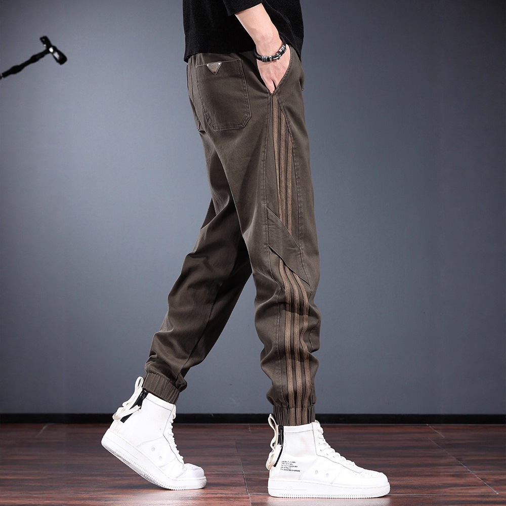 咖啡色宽松束脚休闲裤男秋季美式复古侧边条纹松紧腰工装哈伦裤潮
