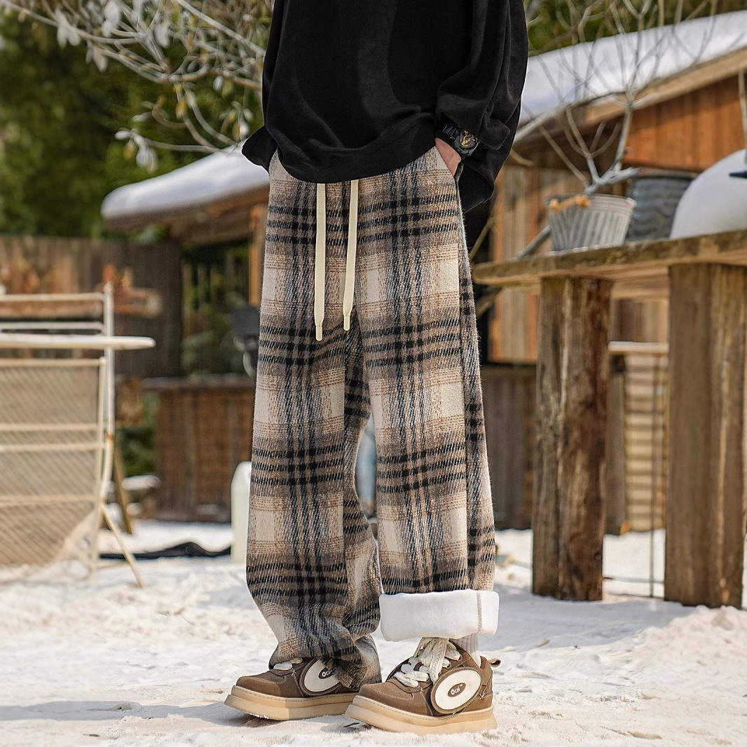 毛呢格子休闲裤男2025秋冬季新款加绒加厚棉裤青少年宽松阔腿裤子