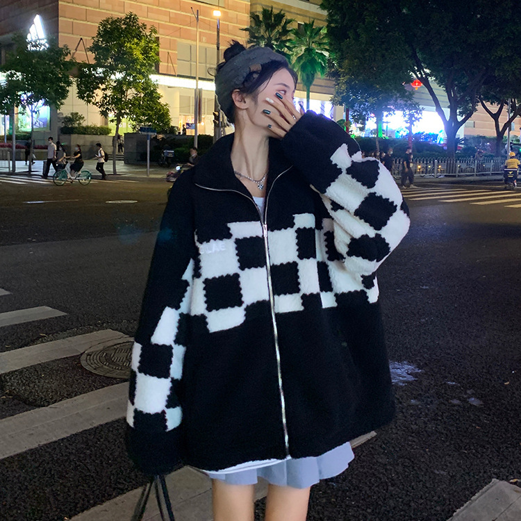 立襟の短いガーディアンの女性は秋冬にベルベットが厚くてゆるいinsが怠惰な風の子羊のベルベットのカーディガンのジッパーコートを着ている
