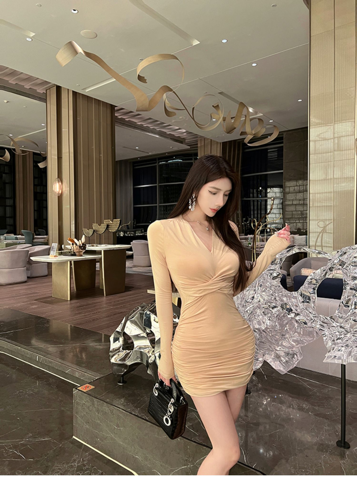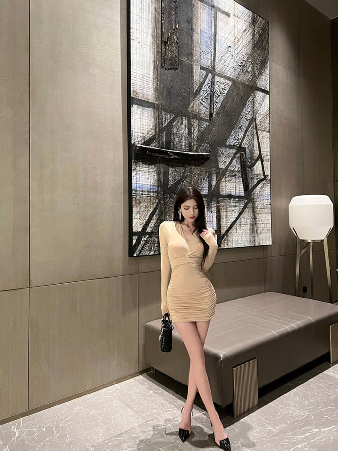 ギャルの低い胸のvネックの長袖のワンピースの女性の早い春の新型のネットの赤い紫色の弾力性のセクシーなa字のお尻のスカート