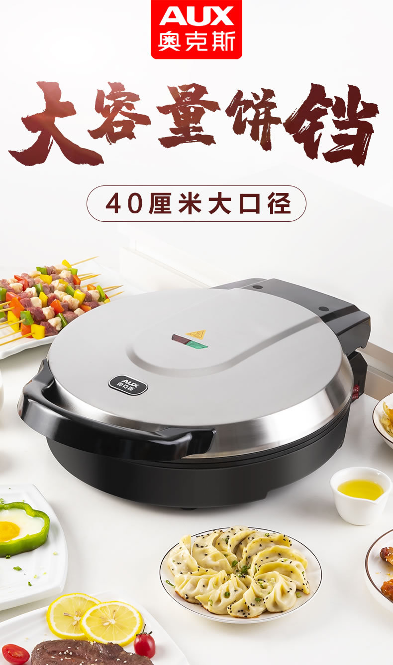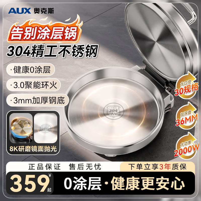 奥克斯新款加深加大304不锈钢0涂层电煎锅烙饼机电饼铛可丽饼机