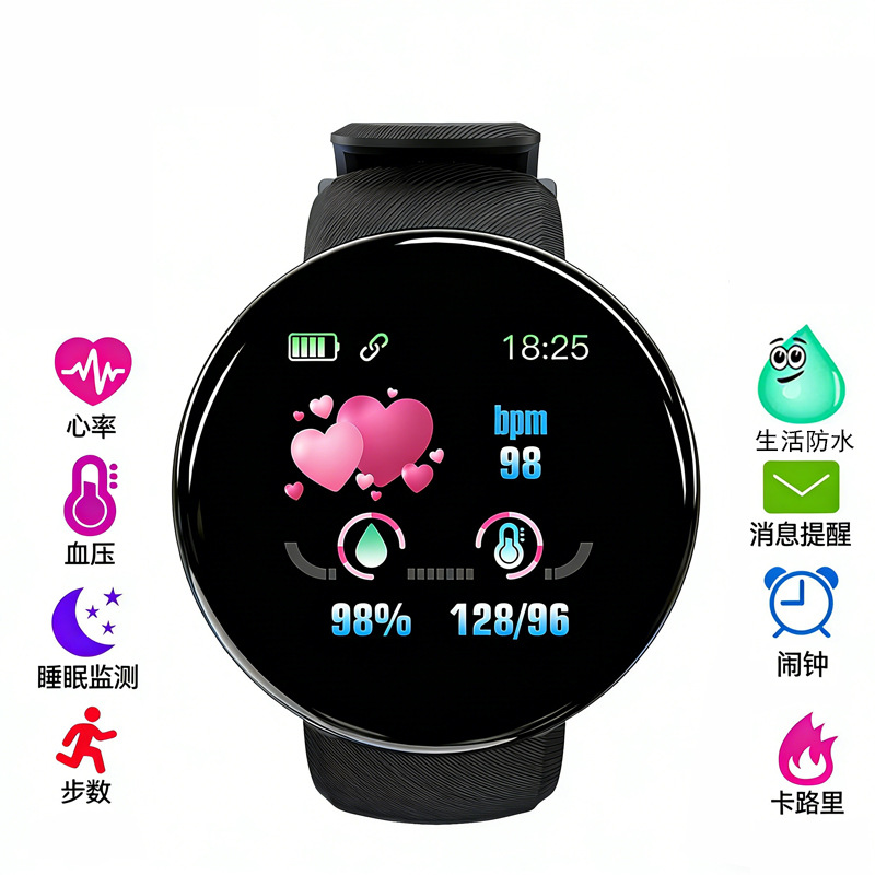 D18智能彩屏手表运动计步信息提醒睡眠监测心率健康血氧检测闹钟