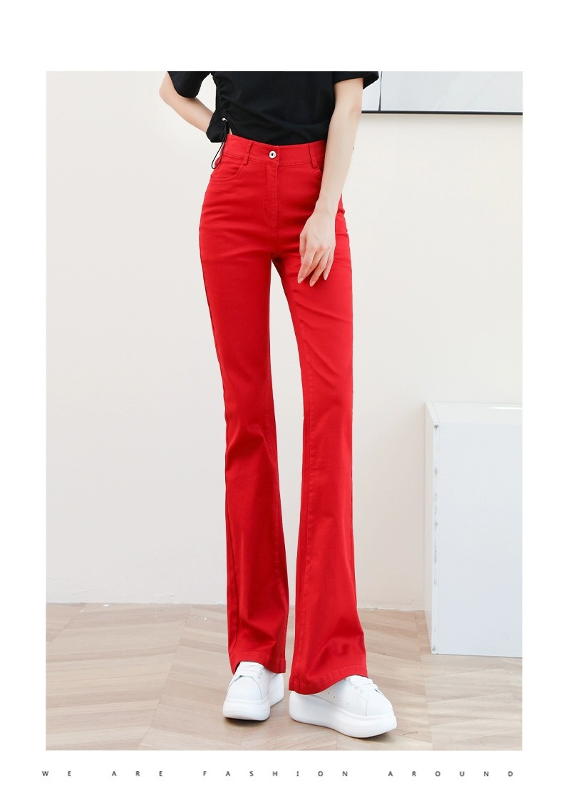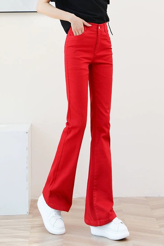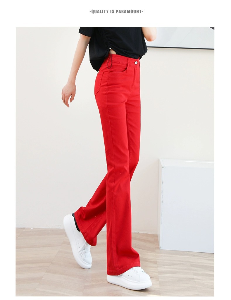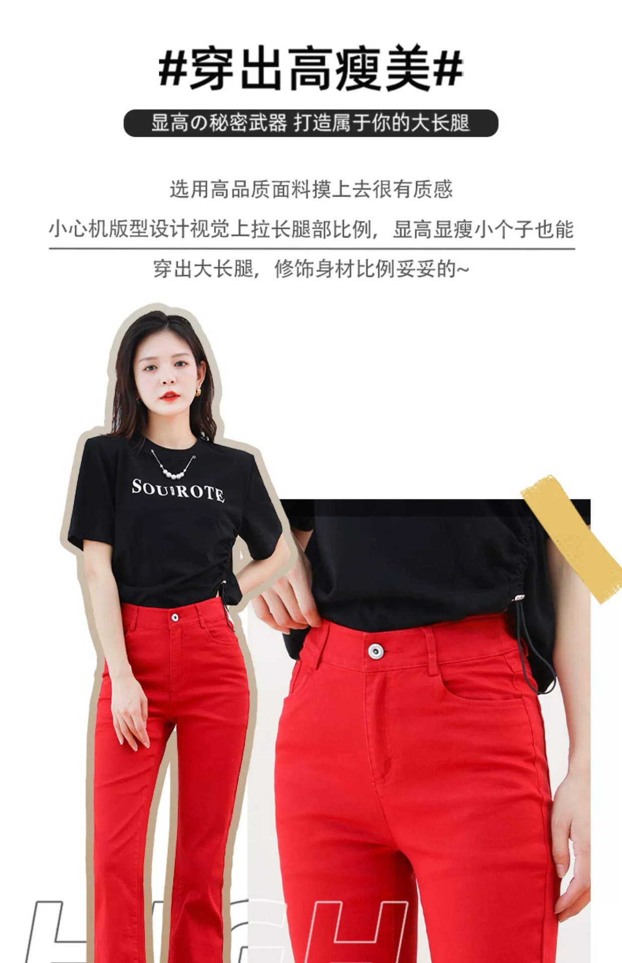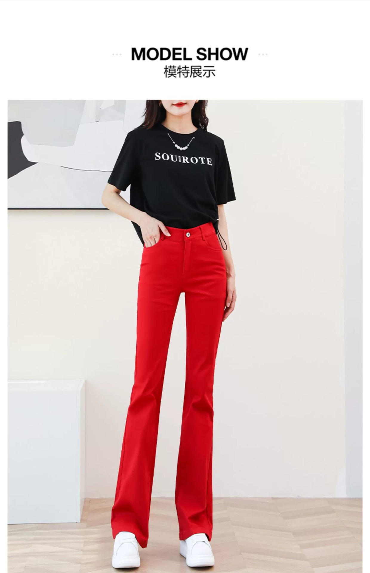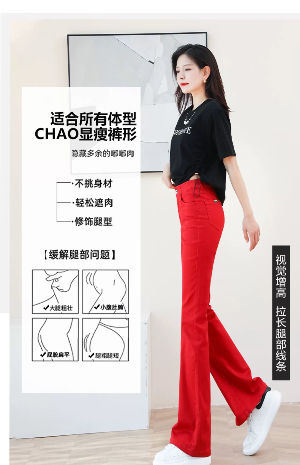 真っ赤なデニムのマイクロフレアパンツ、女性用、2025年夏、薄手、馬蹄型、ハイウエスト、スリムフィット、小柄な方向けのパンツ