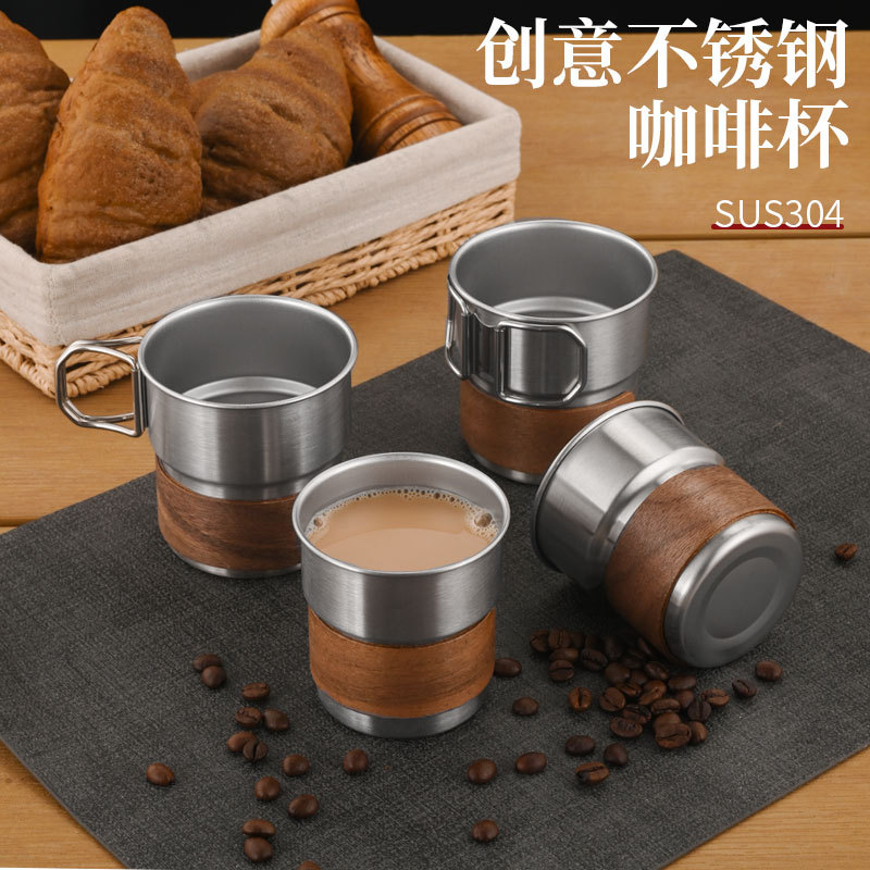 304ステンレス鋼厚いステップカップ木製断熱ストローコーヒーカップ屋外ポータブルミニカップ卸売