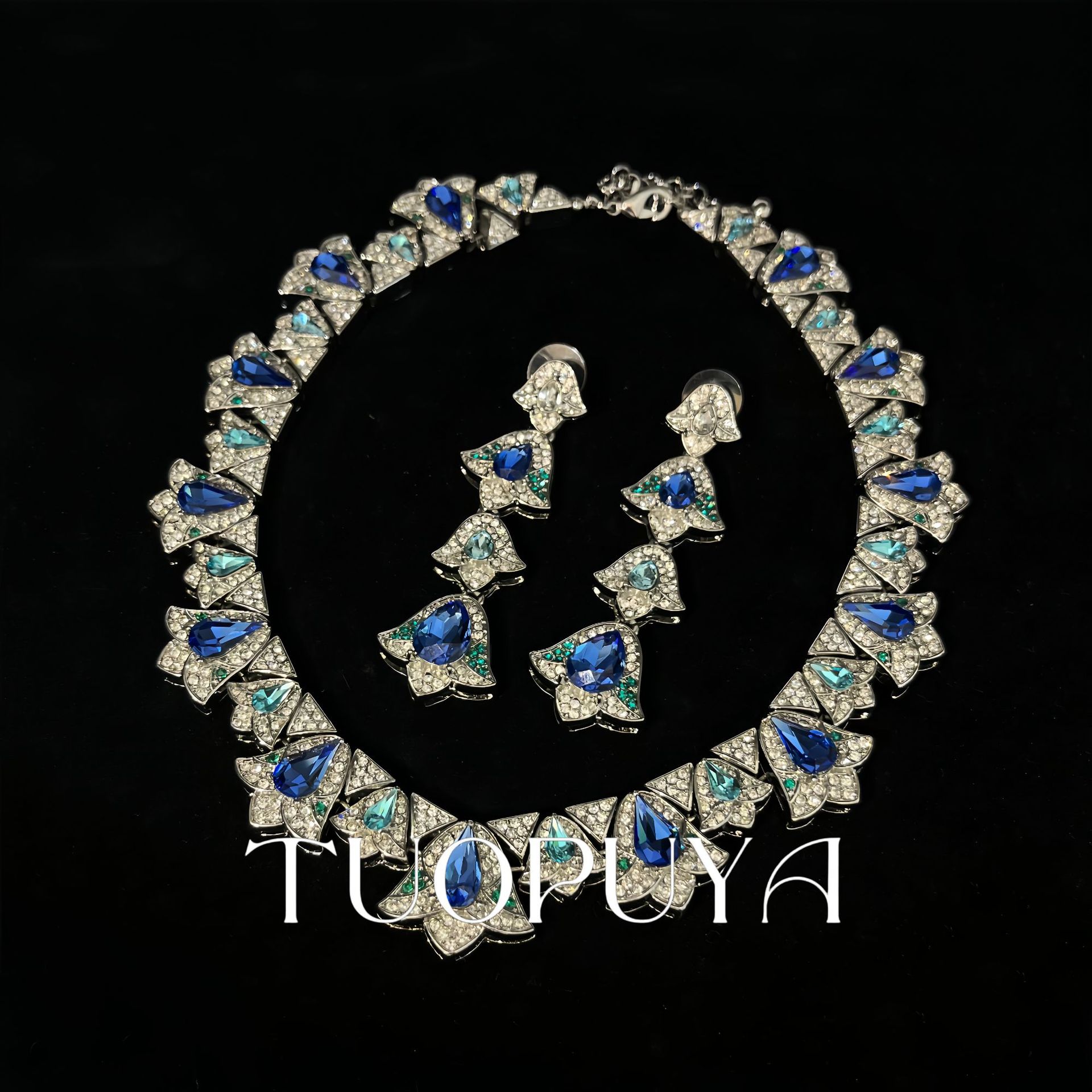 絶妙なヘビーデューティーダイヤモンドブルーラインストーンショルダースイープイヤリング、エレガントでハイエンドのネックレス