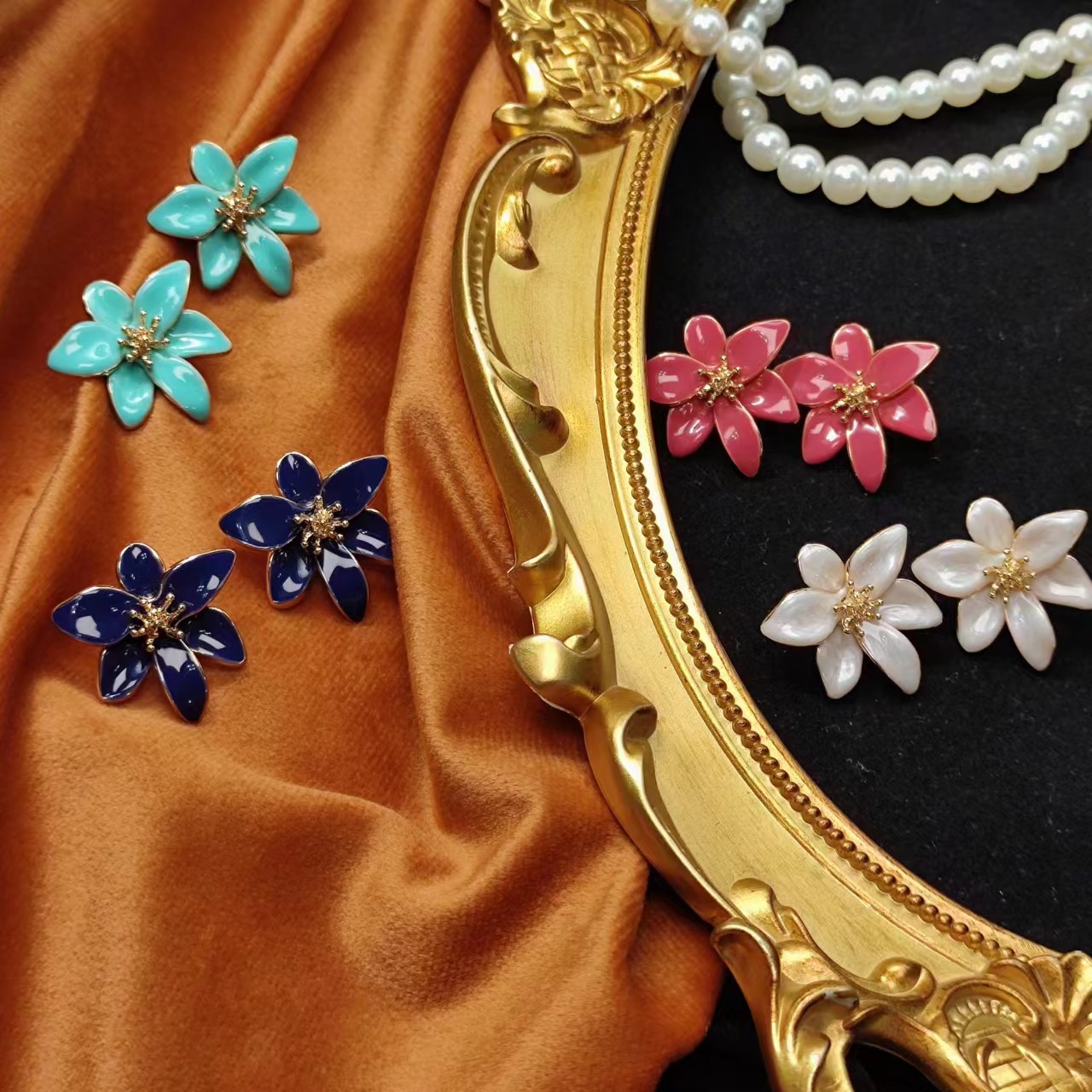 ファッション洗練された手作りの釉薬立体白い花ピアスの小さなデザインエナメル指輪セット