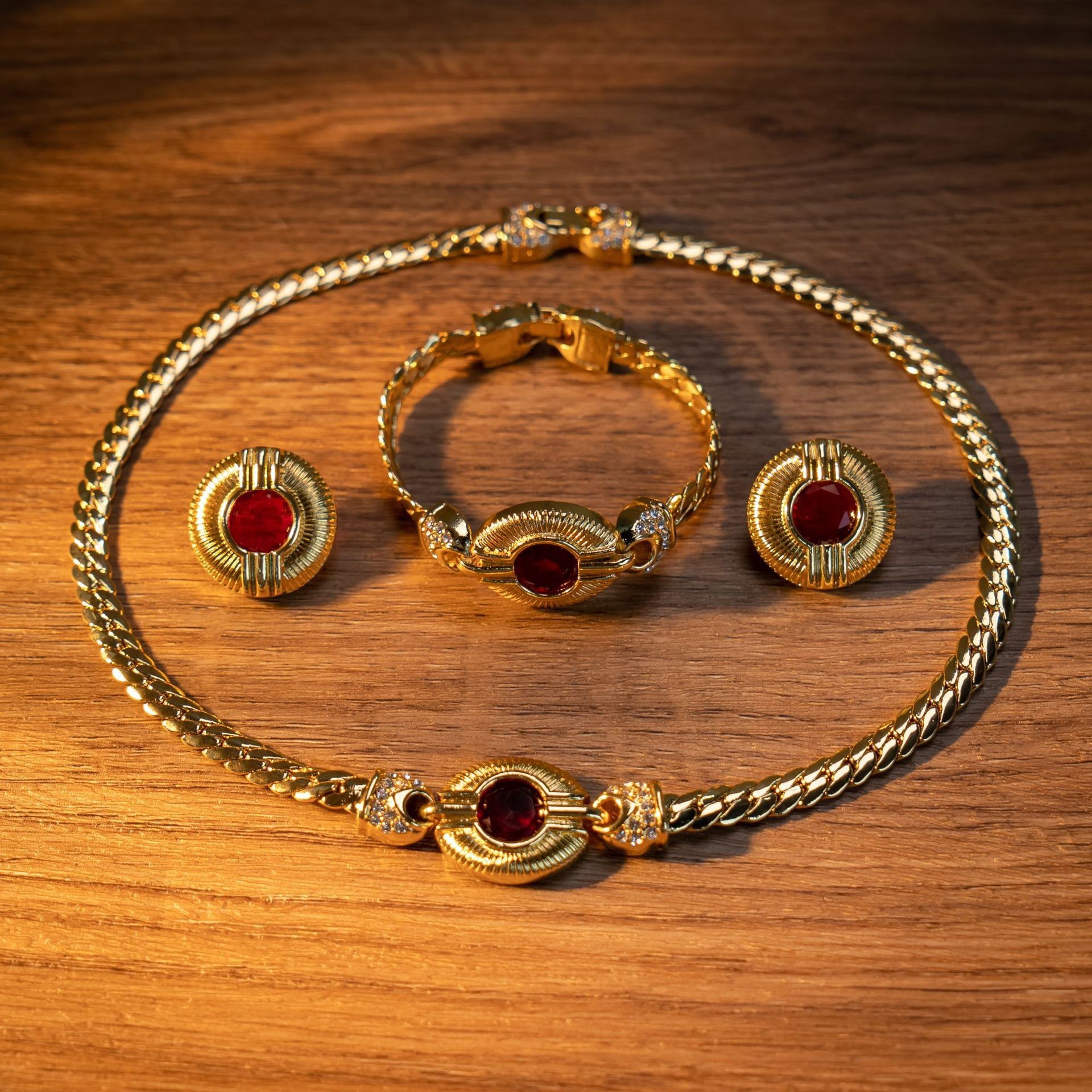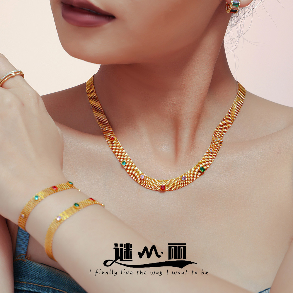 謎麗ins網鎖リボン幾何学多彩ジルコンネックレスブレスレットセットチタン鋼PVDメッキ色落ちしないアクセサリー