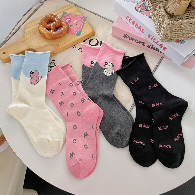 韩国袜子女2025秋季新款卡通小猫中筒袜字母卷边堆堆袜女粉色袜子