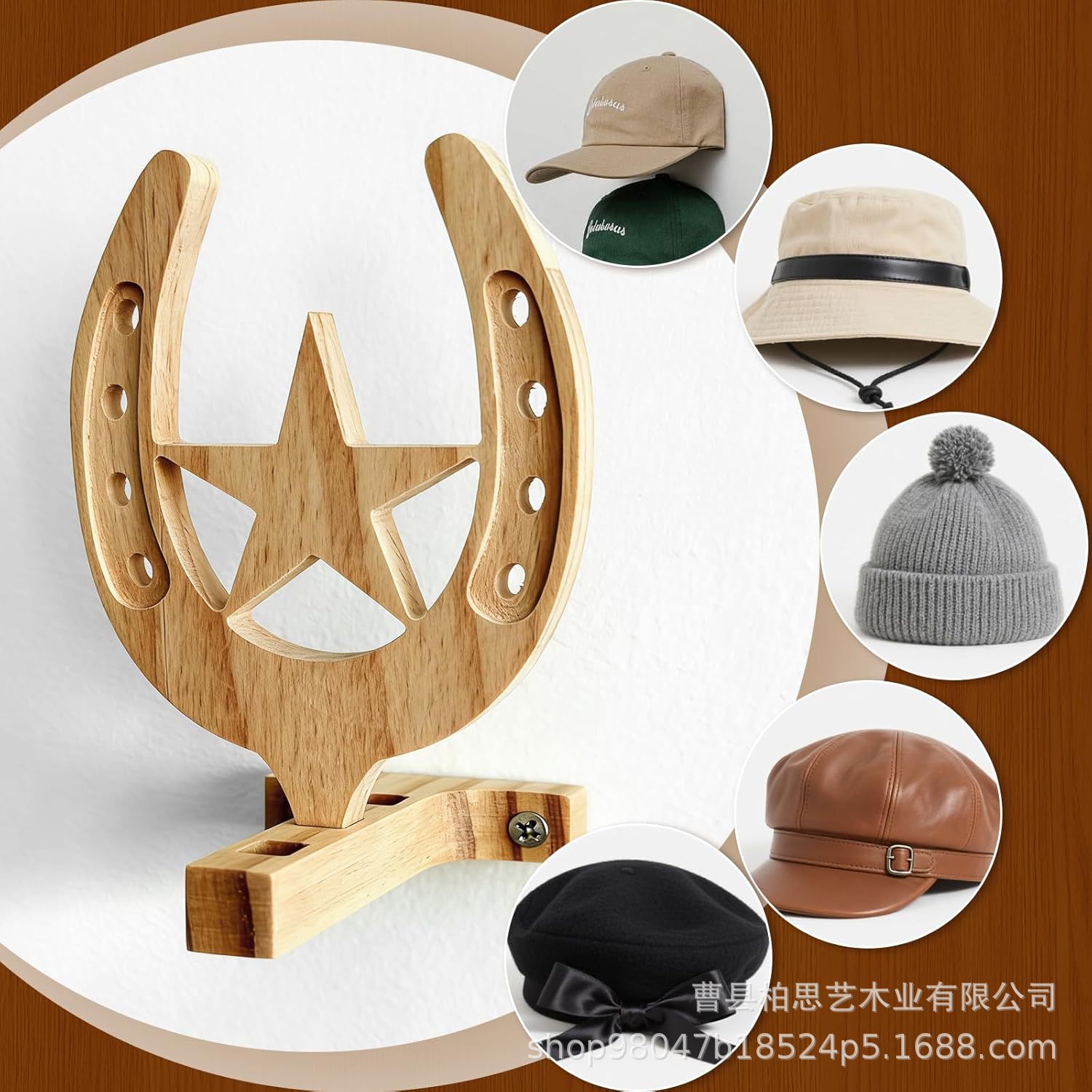 复古木质帽架马蹄铁五角星实木挂帽架 墙上壁挂式帽子展示架