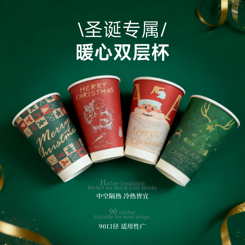 圣诞节奶茶店热销一次性咖啡奶茶杯子带盖隔热纸杯奶茶饮品加厚杯