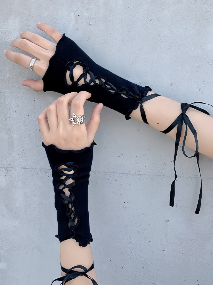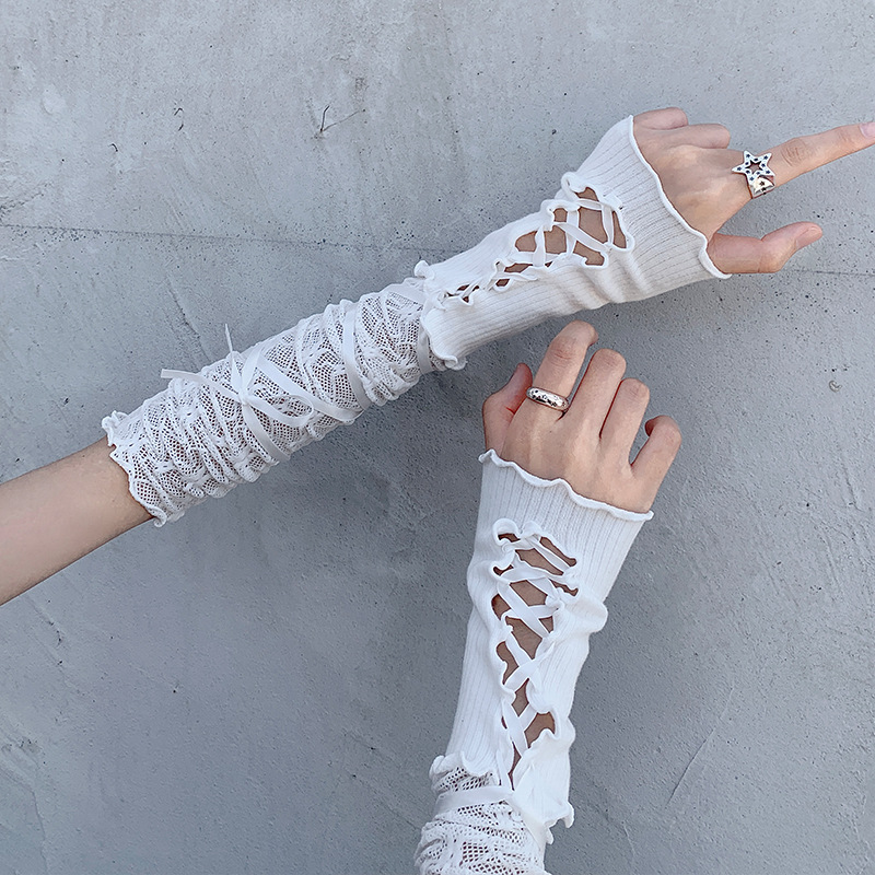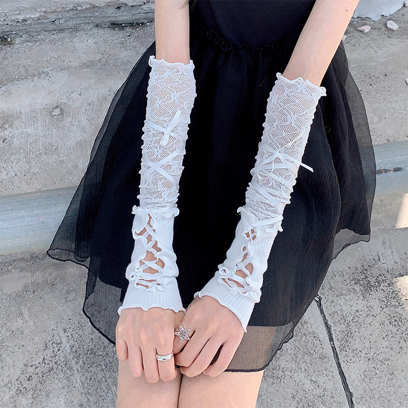韓国の原宿ミレニアムy 2kギャルレースの網糸は蝶結びの薄いカバーの手の袖の日焼け止めの手袋をつなぎます。