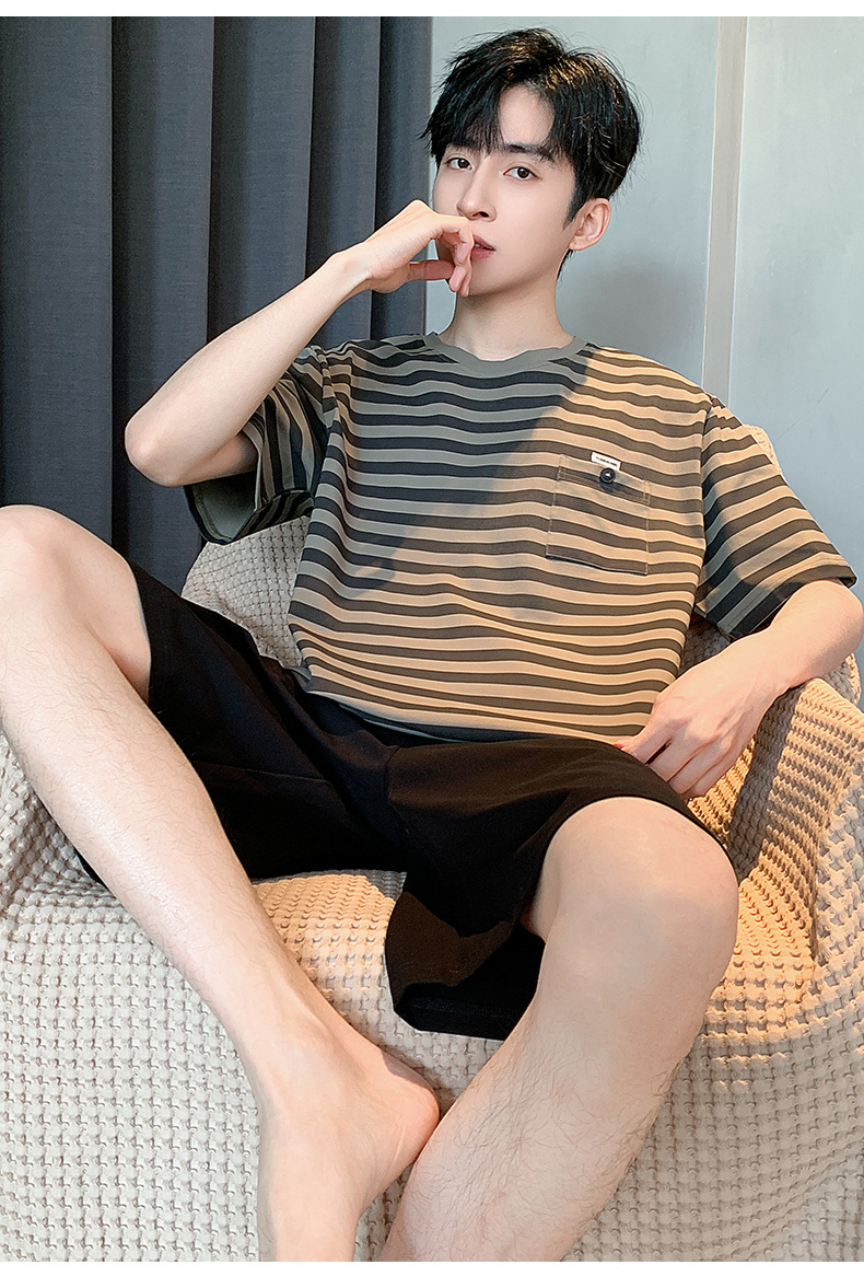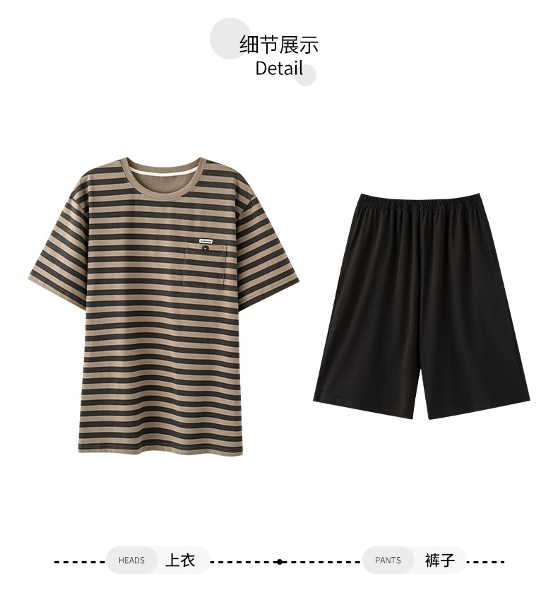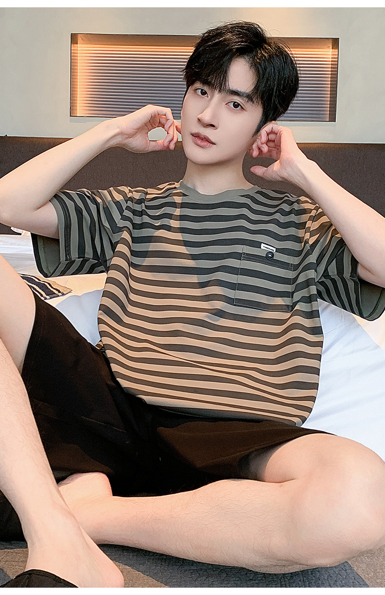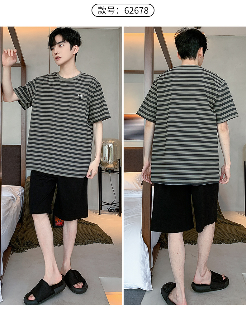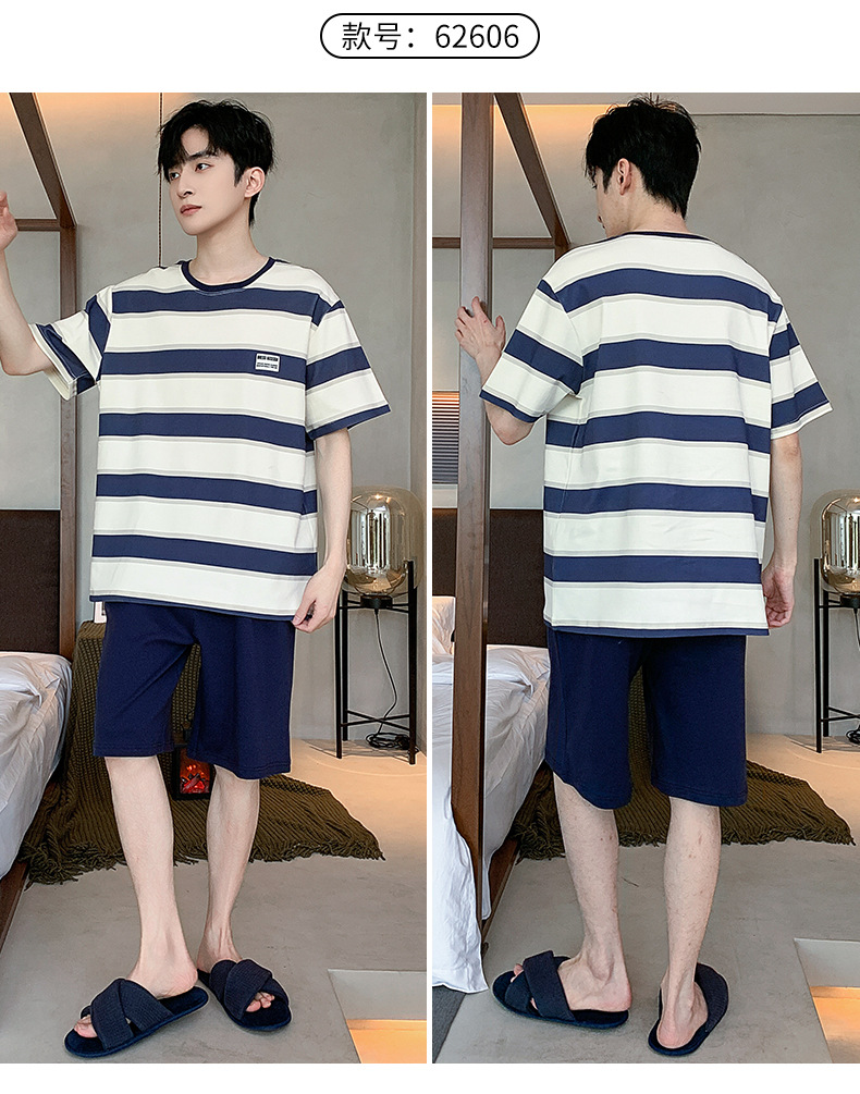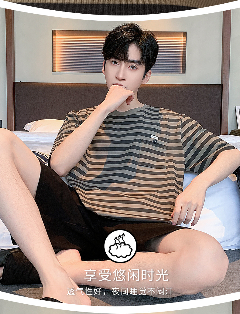 パジャマ半袖半ズボン男の夏の純綿の家庭服のストライプの青年の大きいサイズは家庭服の2つのセットを外に着ることができます。