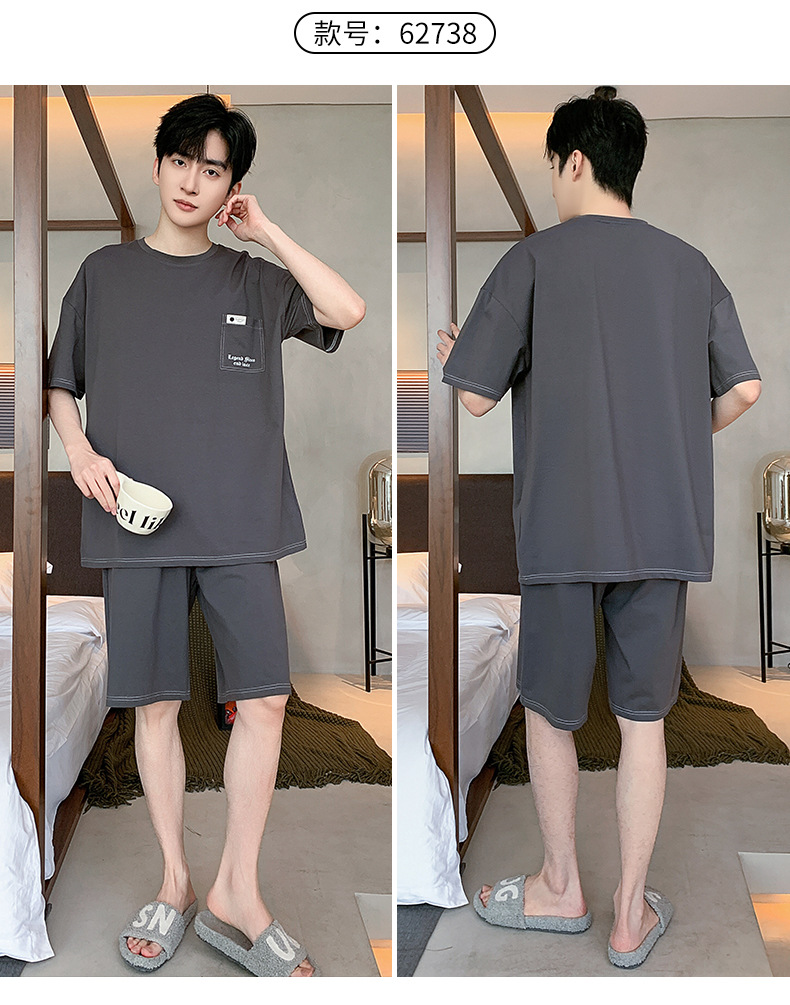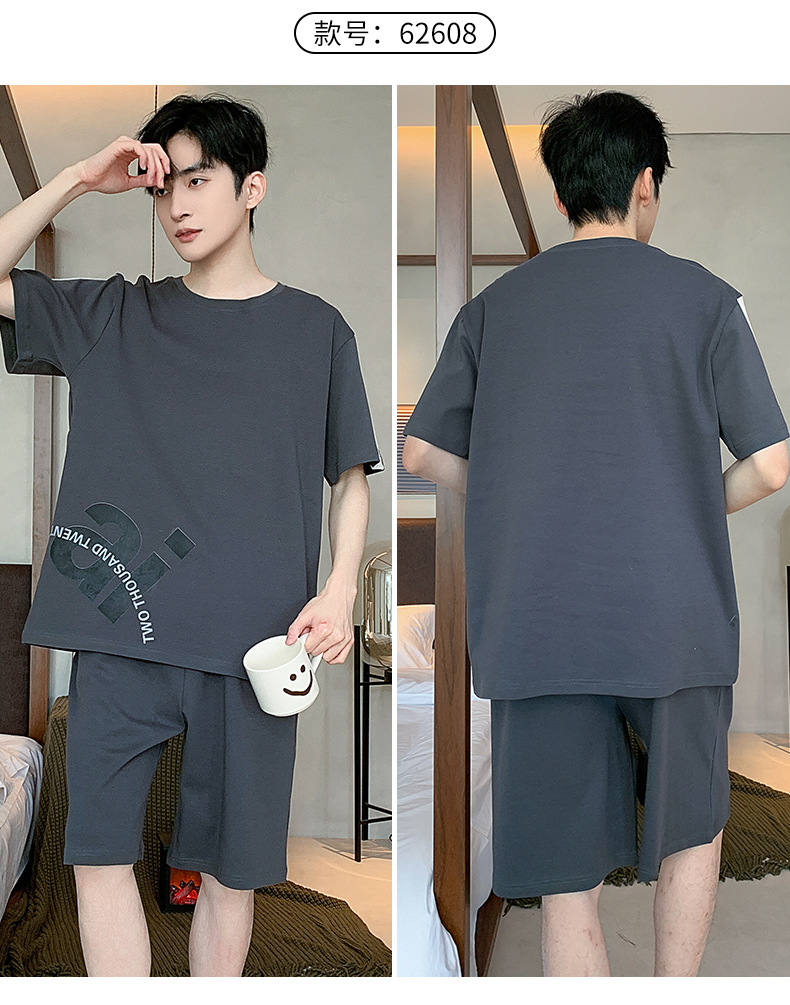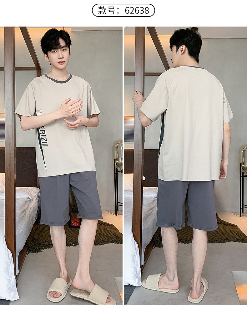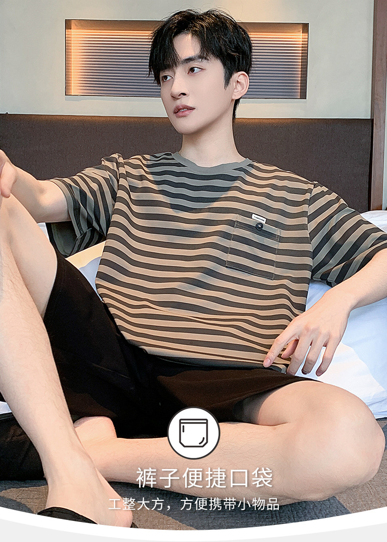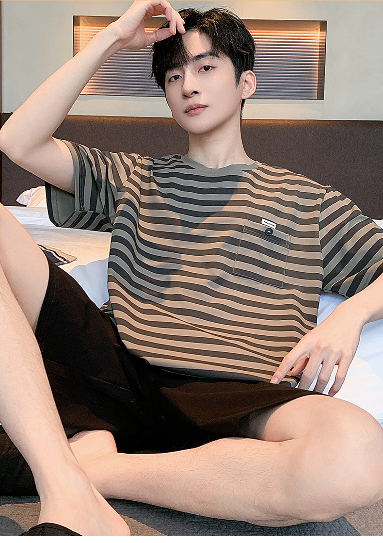 パジャマ半袖半ズボン男の夏の純綿の家庭服のストライプの青年の大きいサイズは家庭服の2つのセットを外に着ることができます。