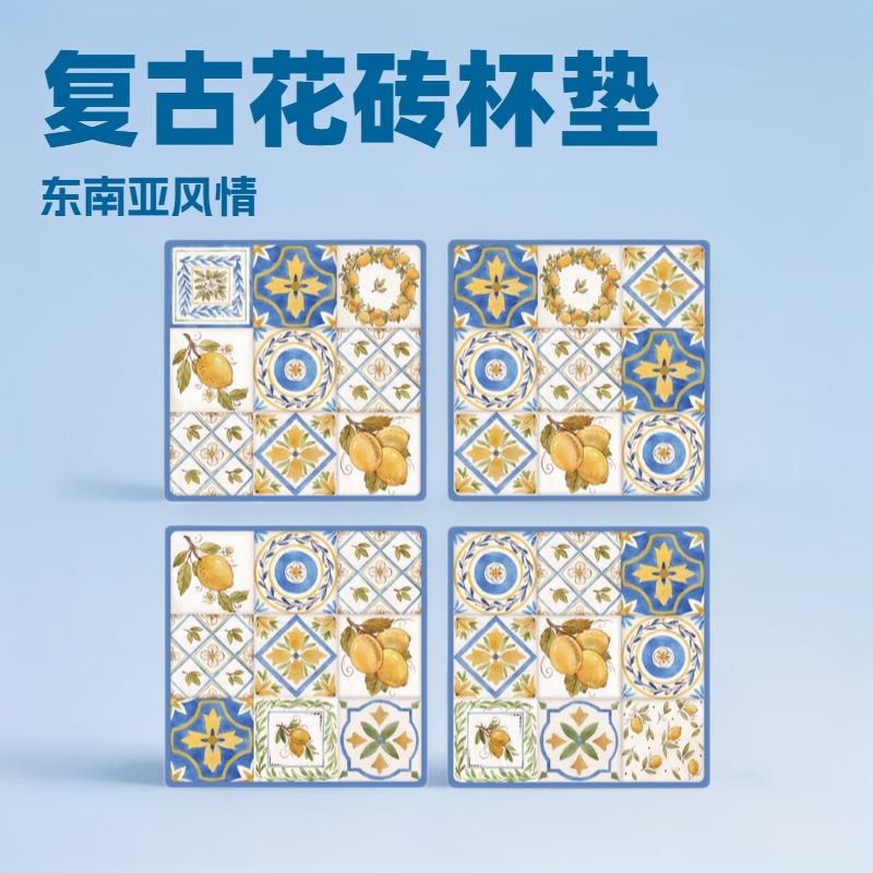 复古花砖陶瓷杯垫批发方形diy吸水防滑隔热UV印刷闽南情怀东南亚