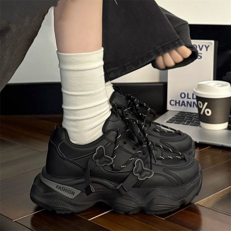校园黑色运动鞋女款春夏2026新款百搭爆款蝴蝶增高厚底休闲老爹鞋