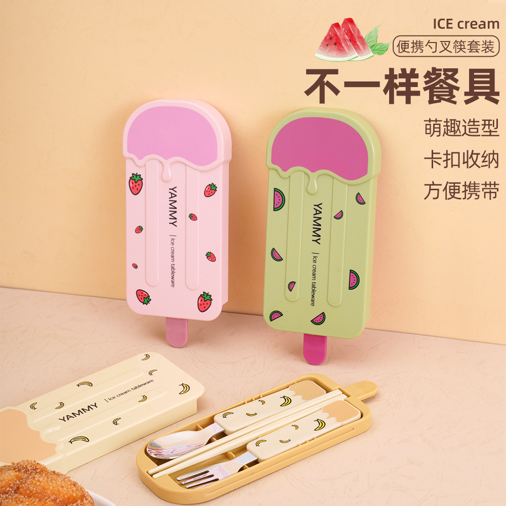 304 ステンレス鋼家庭用子供用ポータブル楽しいカトラリーボックスアイスクリーム 3 点セットかわいいスプーンフォーク箸