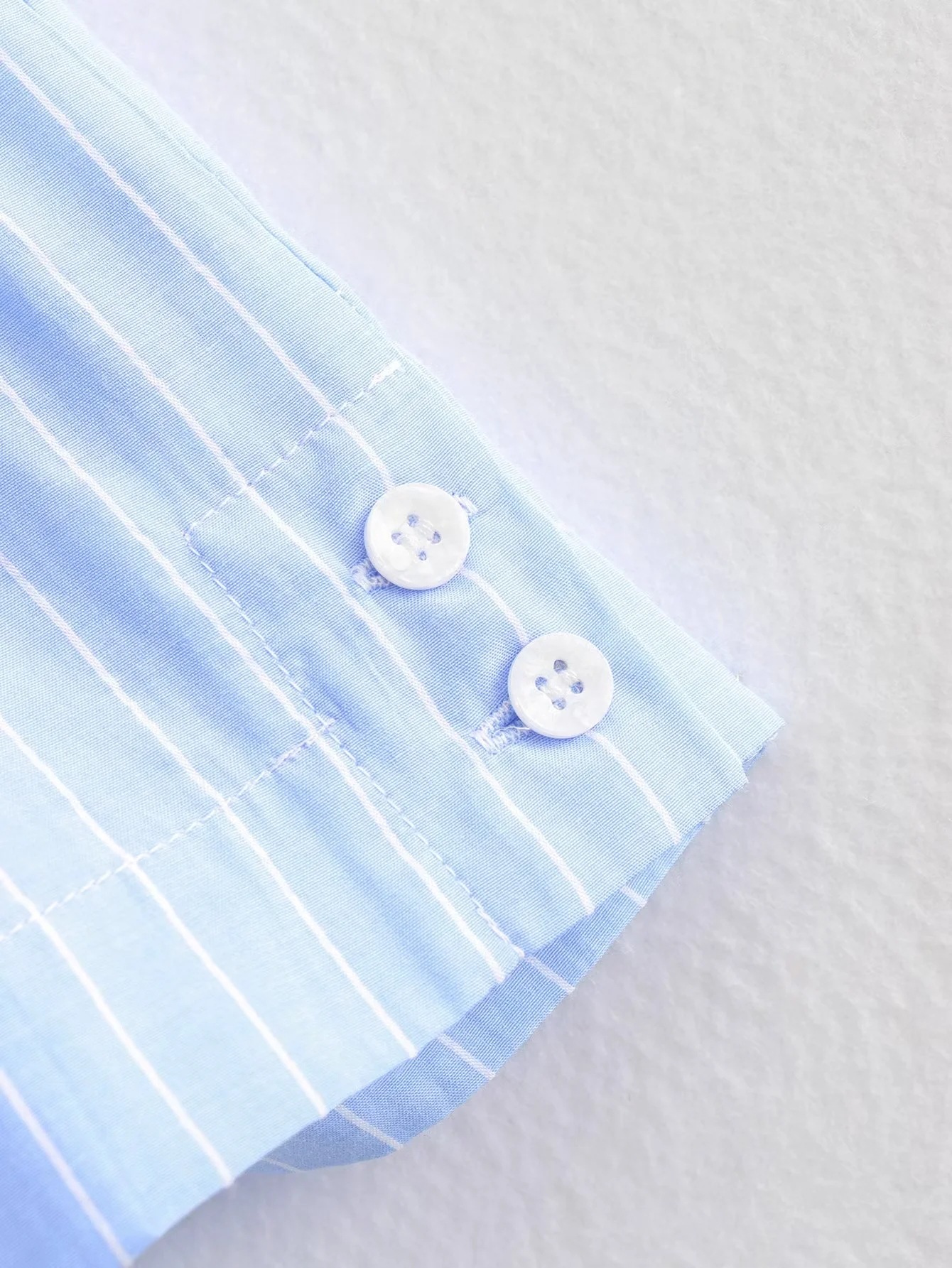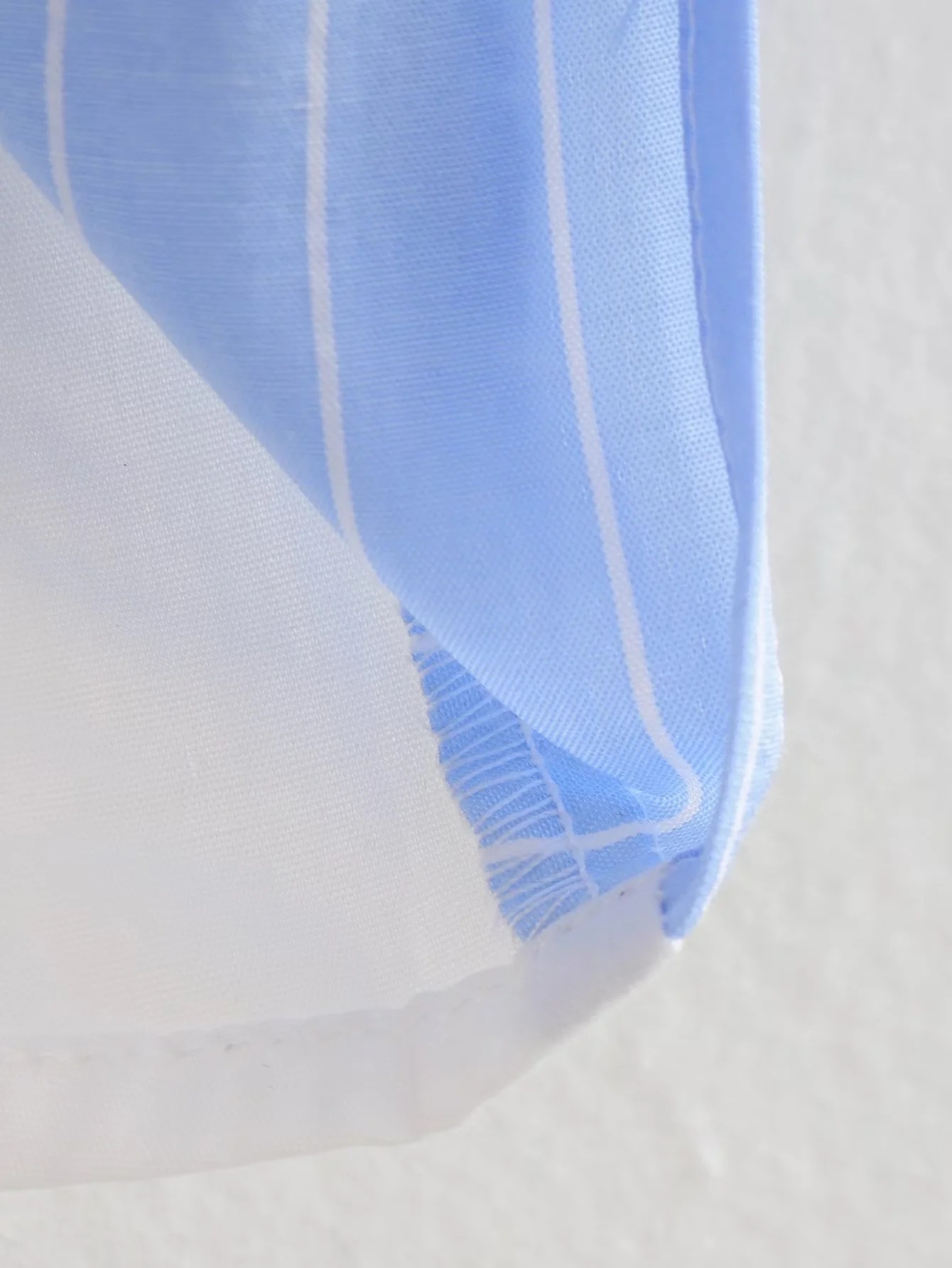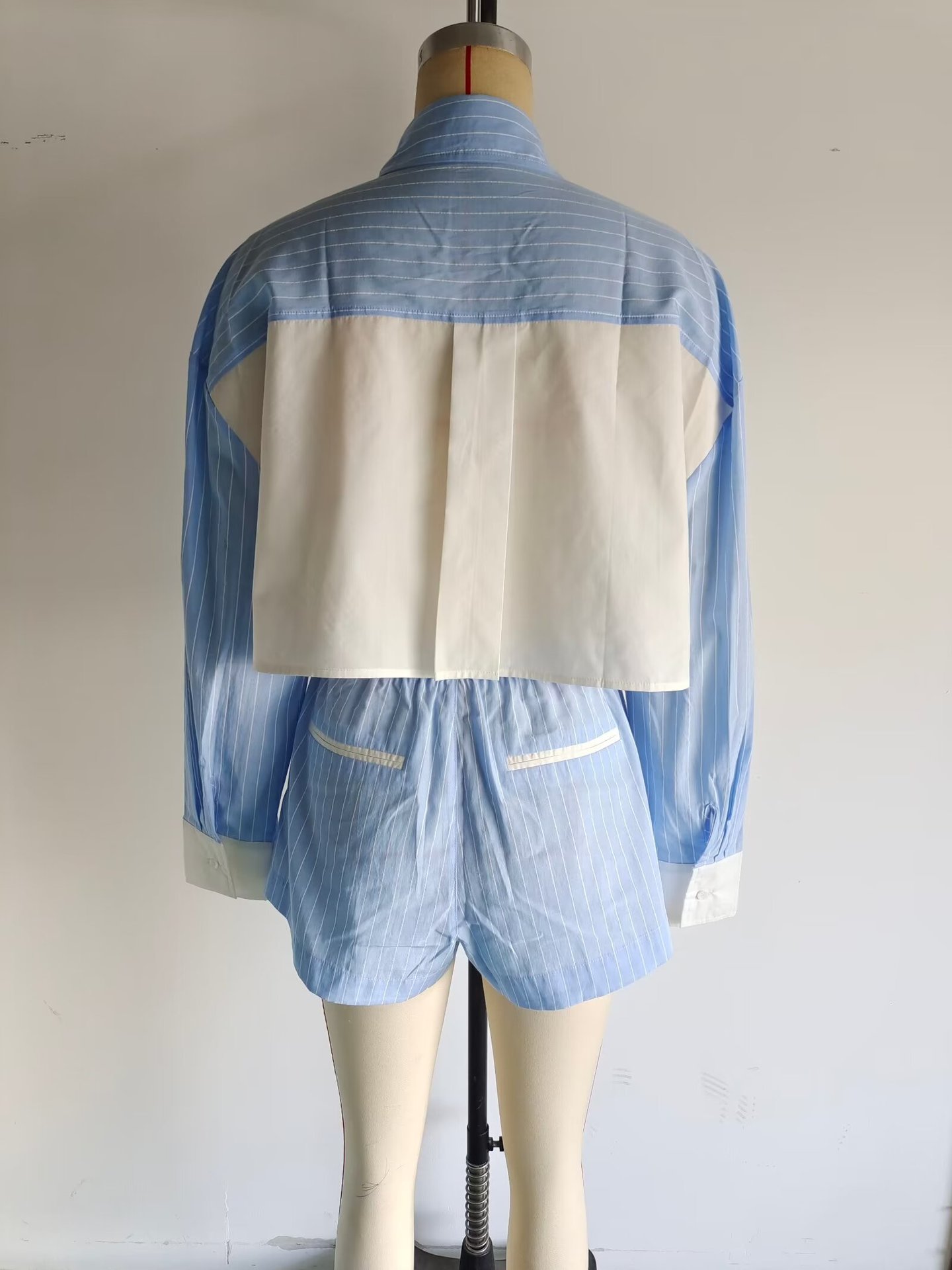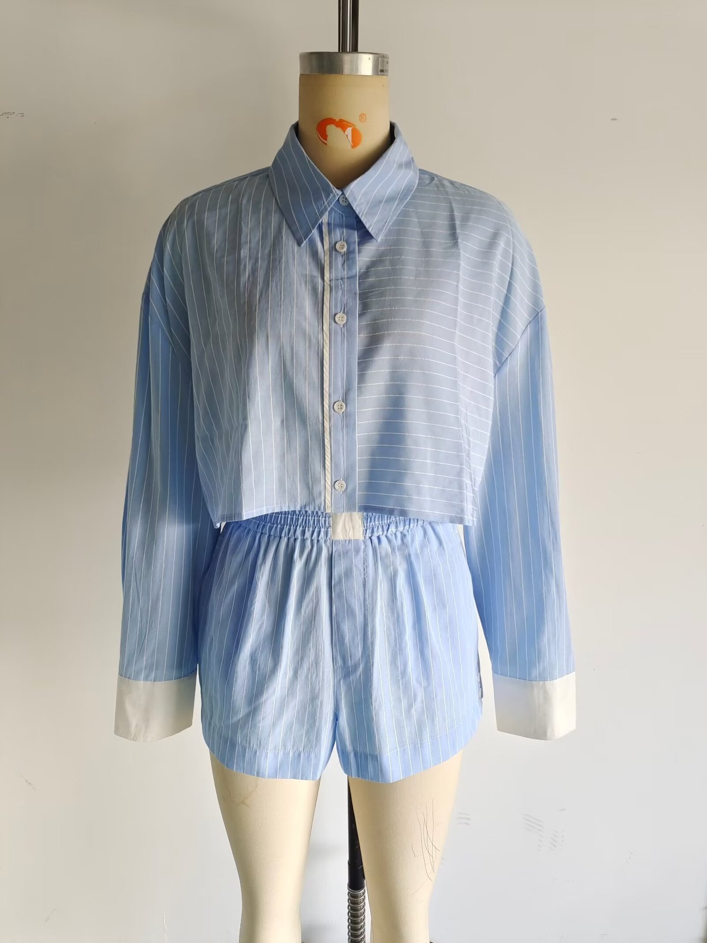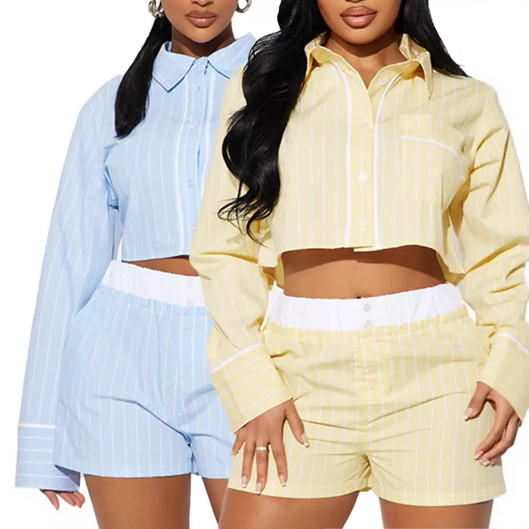 2025 新しい夏の女性のヨーロッパとアメリカのファッションコントラストストライプショートシャツ + ショーツツーピーススーツ A19697