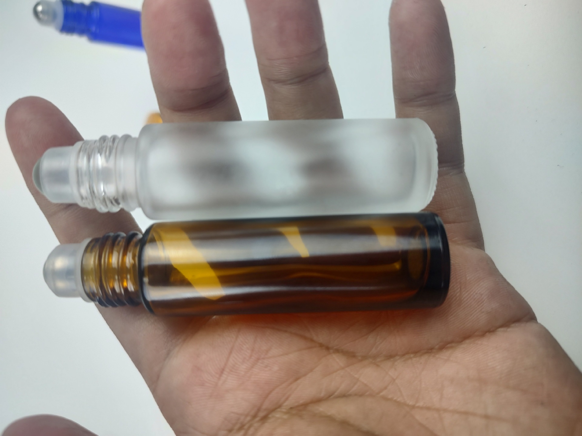 メーカースポット10ml茶色のボール透明ブルーのつや消しスチールボールがビーズ香水瓶のガラスボールを作っています。