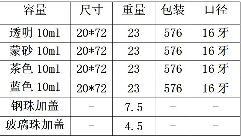 規格型番 10ml;透明; ガラス,10ml; ブルー; ガラス,10ml;コーヒー色;ガラス,10ml; すりガラス,10ml; 各種蓋; ガラス