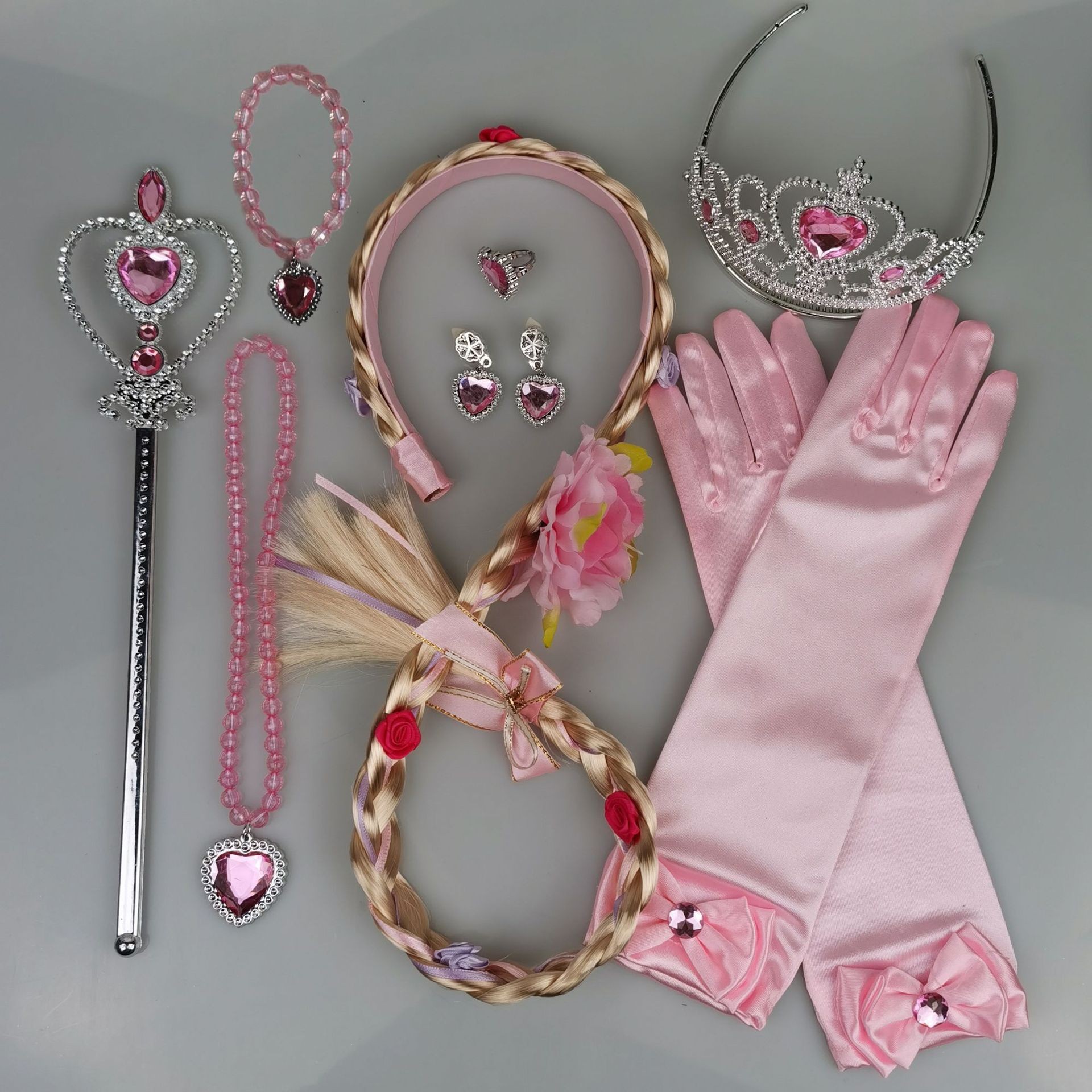白雪姫cosはパーティーのキャラクターを飾って金色の王冠の魔法の棒のかつらの手袋の蝶結びのセットを演じます。