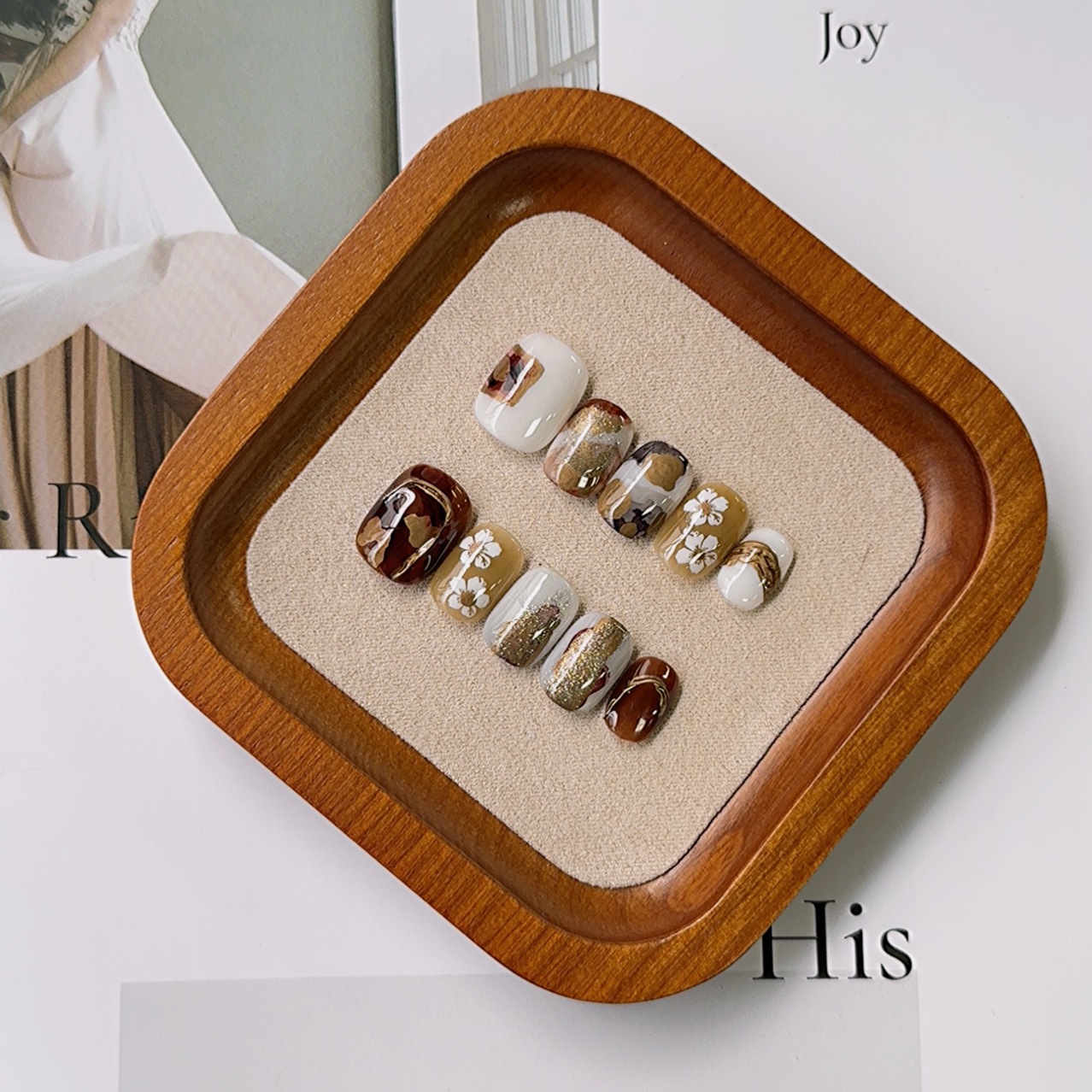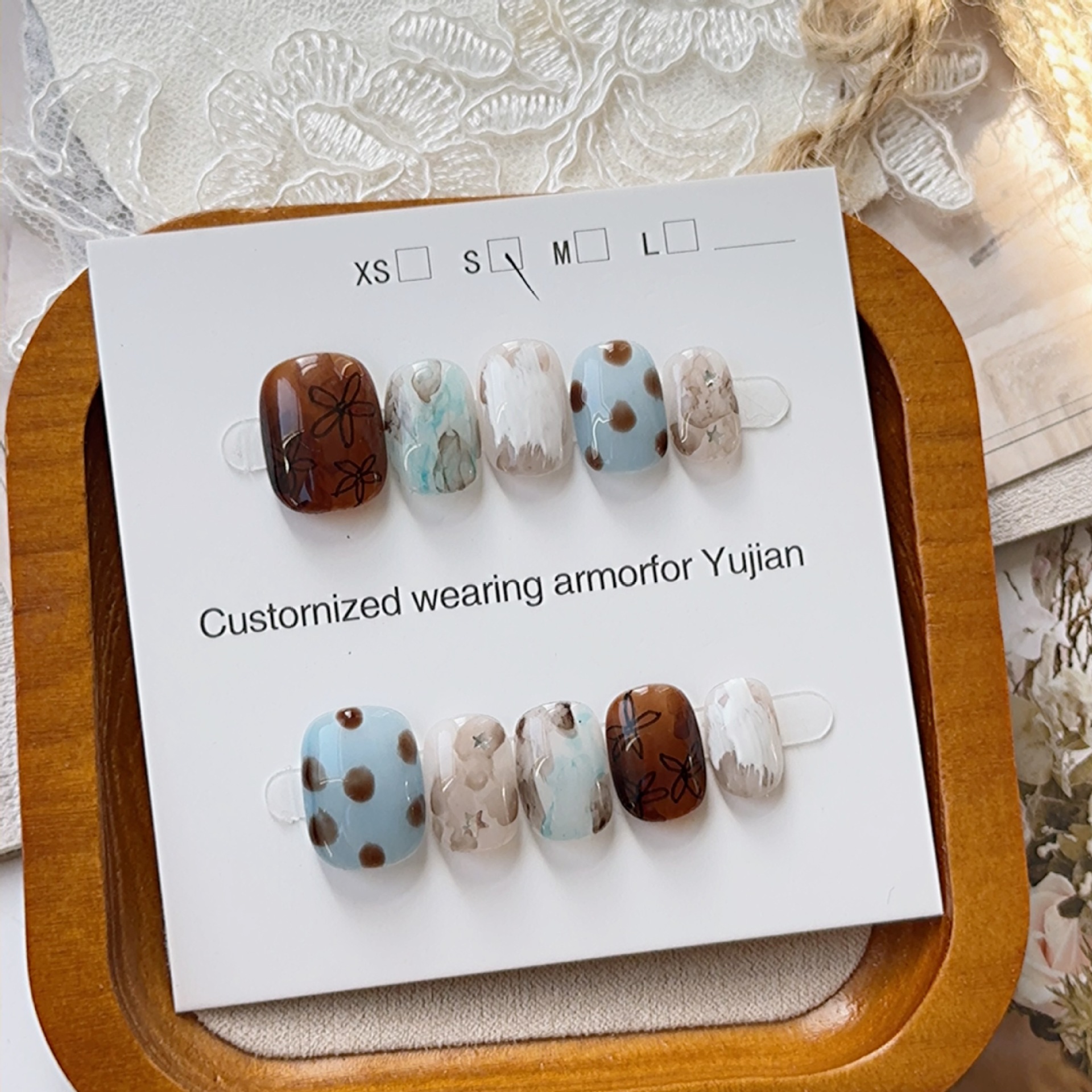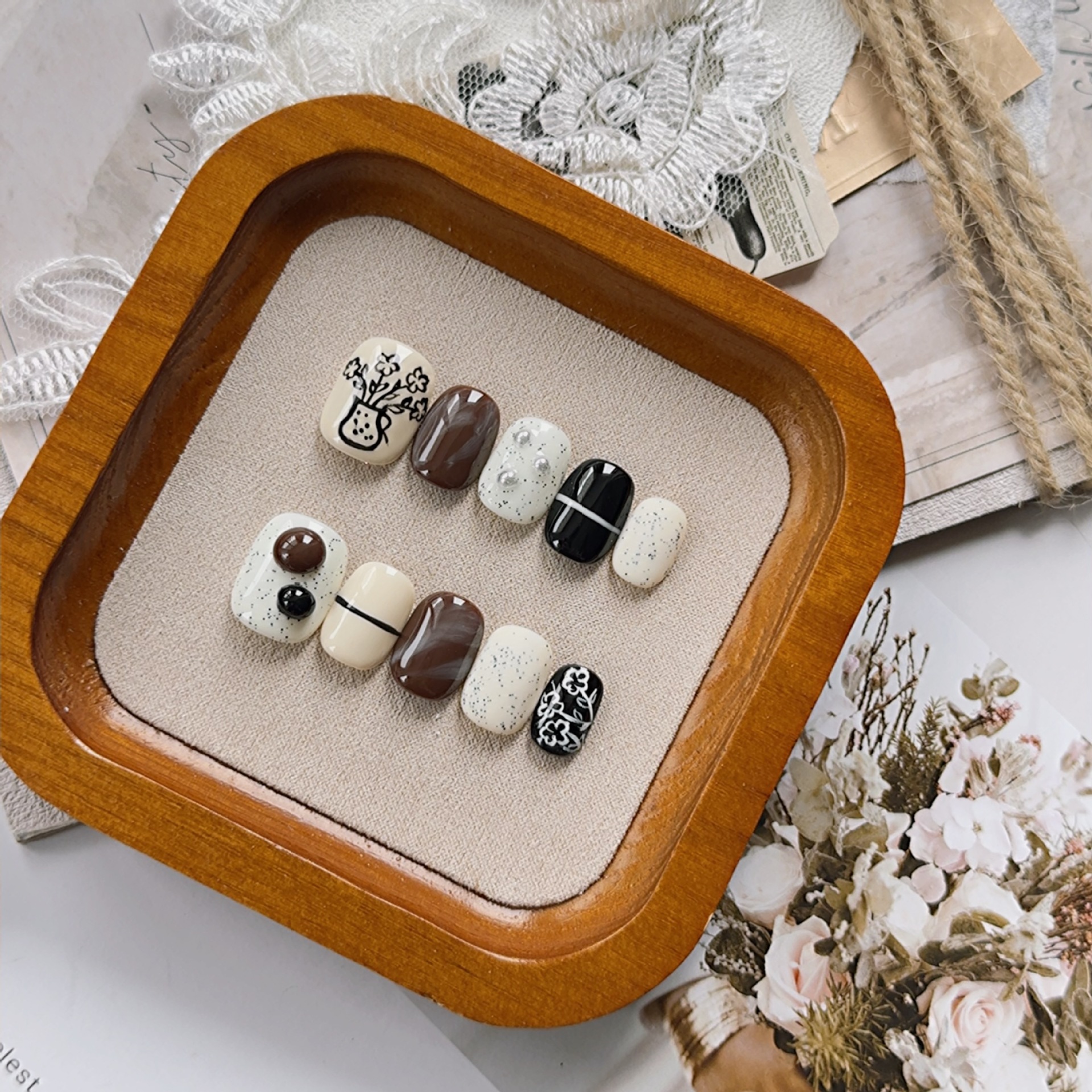 手作りのウェアラブルネイル、癒しの手描きの花柄、茶色のコーヒーの質感、高級文学風の薄いネイル完成品