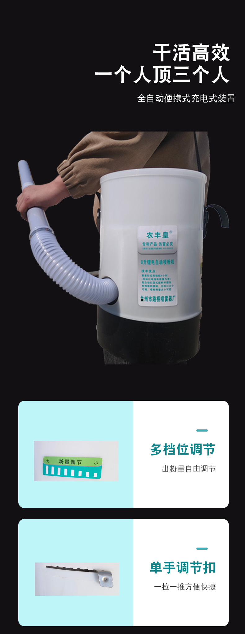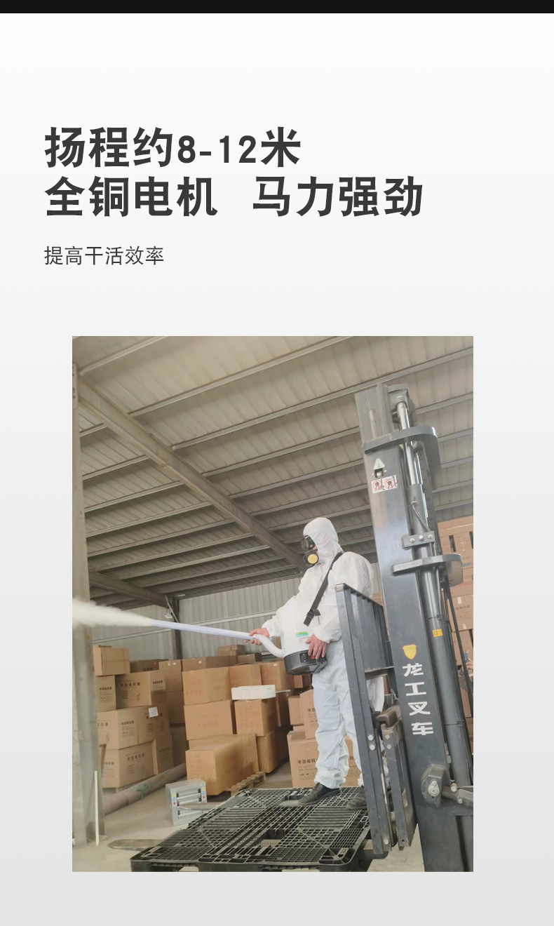 大棚里可喷8-10米左右,电机转速10000转,耗电电流12A-14A,最大功率170W,一分钟可喷0.68公斤