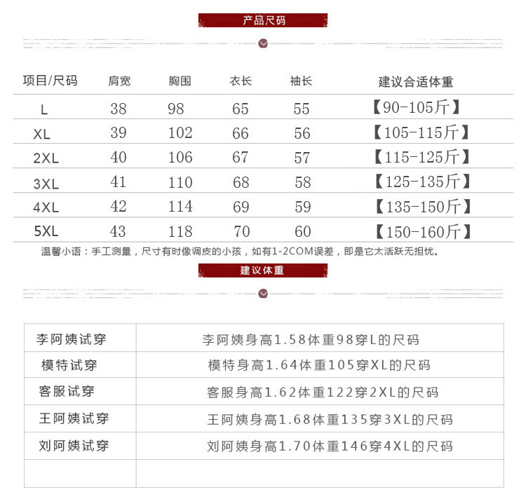 サイズ Lは80-105斤を着ることをお勧めします,Xlは105-115斤を着ることを提案した,2xlは115-125斤を着ることを提案した,3xlは125-135斤を着ることを提案した,4xlは135-145斤を着ることを提案した,5xlは145-160斤を着ることを提案した