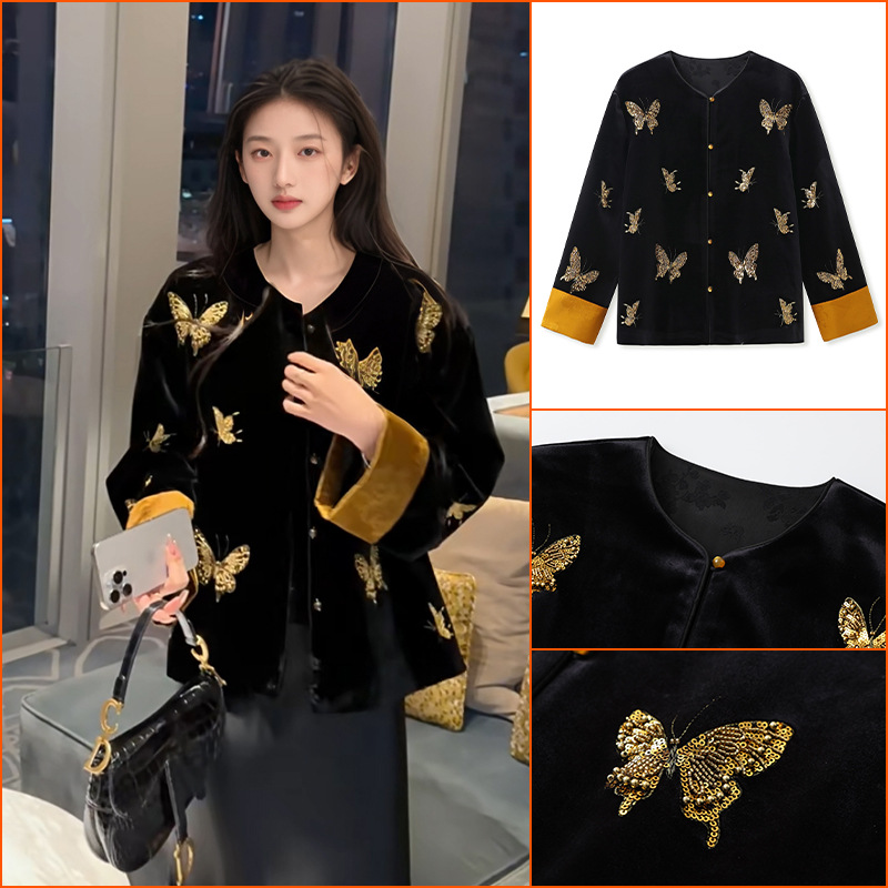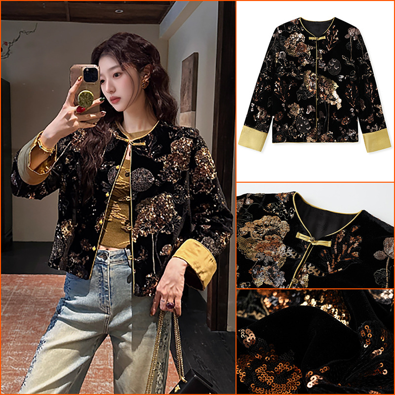 新中式气质丝绒珠片刺绣上衣国风重工钉珠设计感加绒短外套 N9072