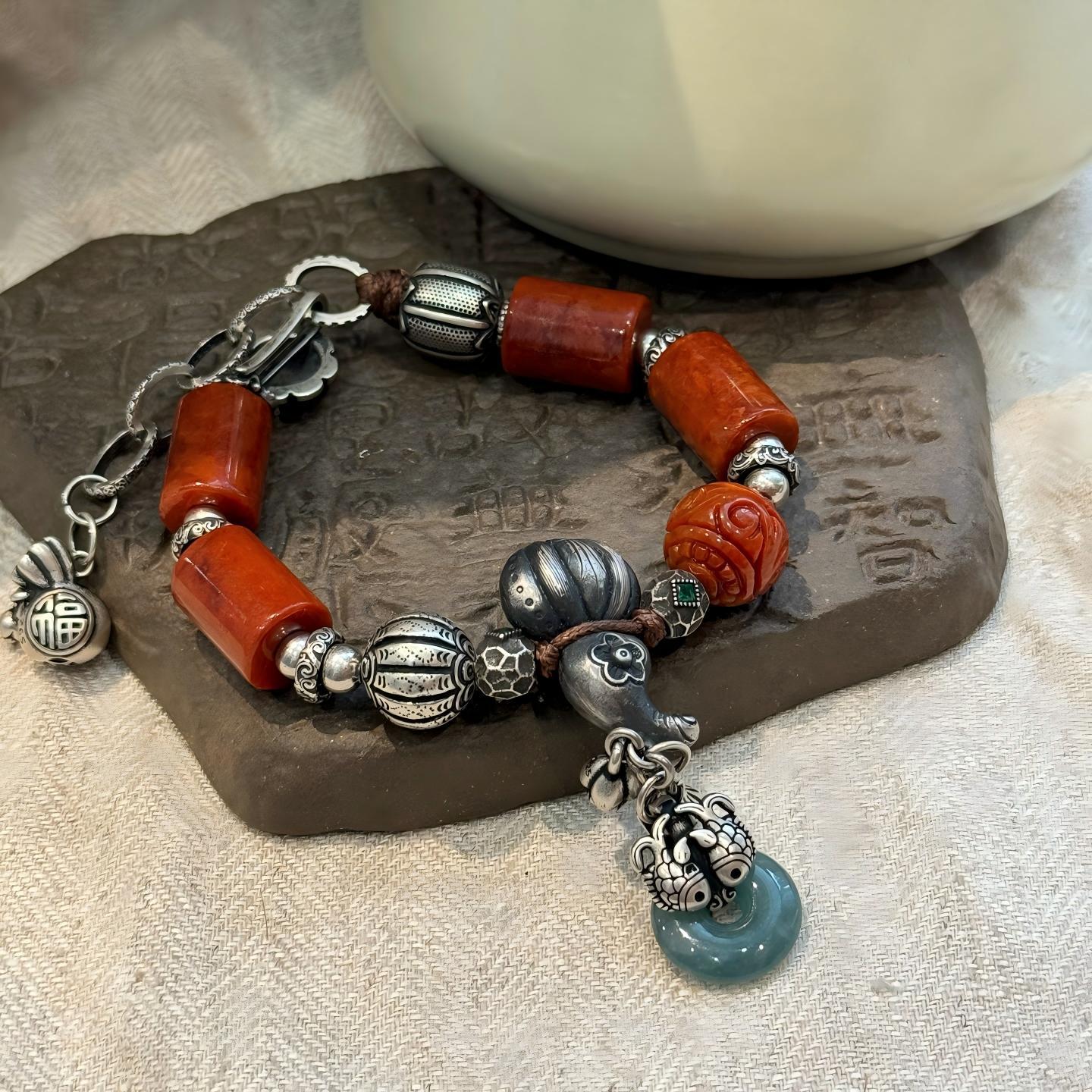 Qing S925 シルバー赤翡翠バレルビーズひょうたん安全バックル福袋テールペンダントブレスレットライオンバックルヘッドブレスレットブレスレット