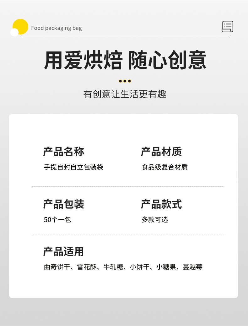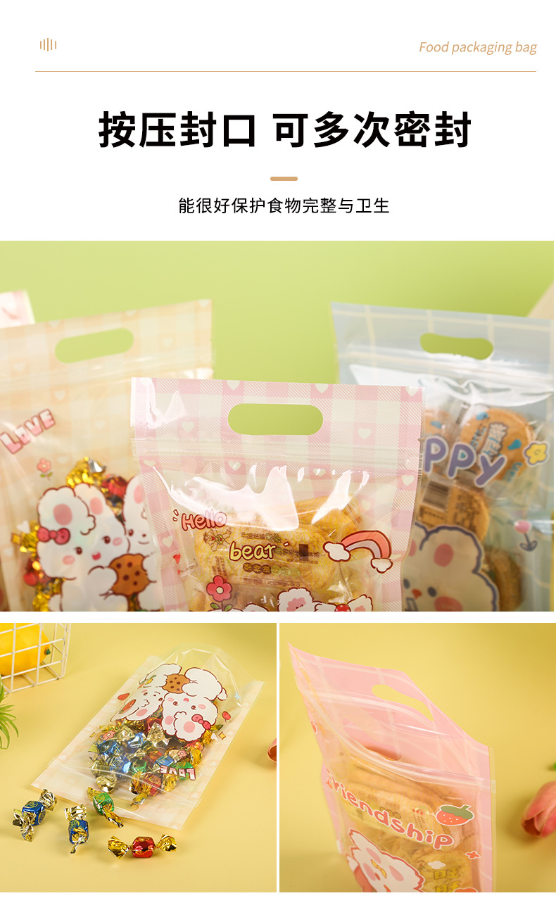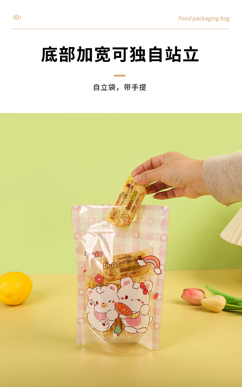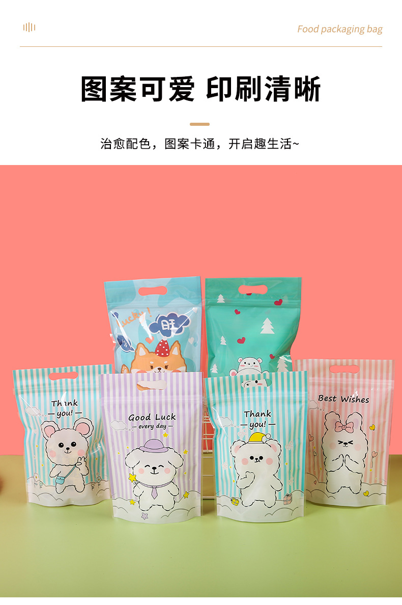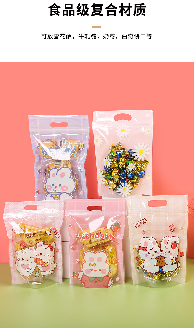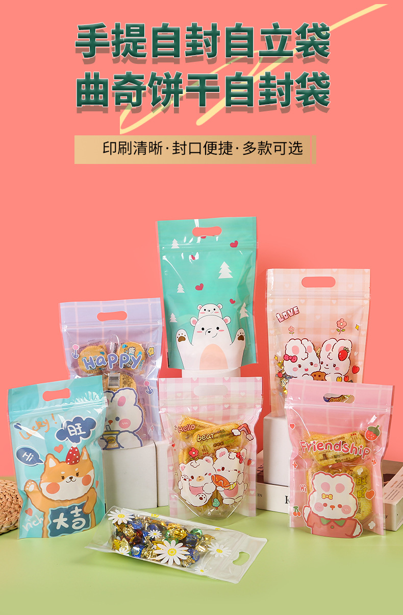 用途:内置自封条,手捏即封,可站立,装各种零食,饼干,糖果,干果等。