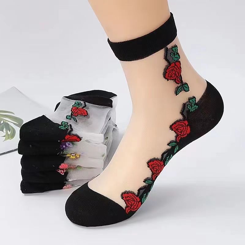 夏の薄いタイプのストッキングの女性のレースの透明なガラスの糸の靴下の快適な通気面の水晶の靴下のバラの花