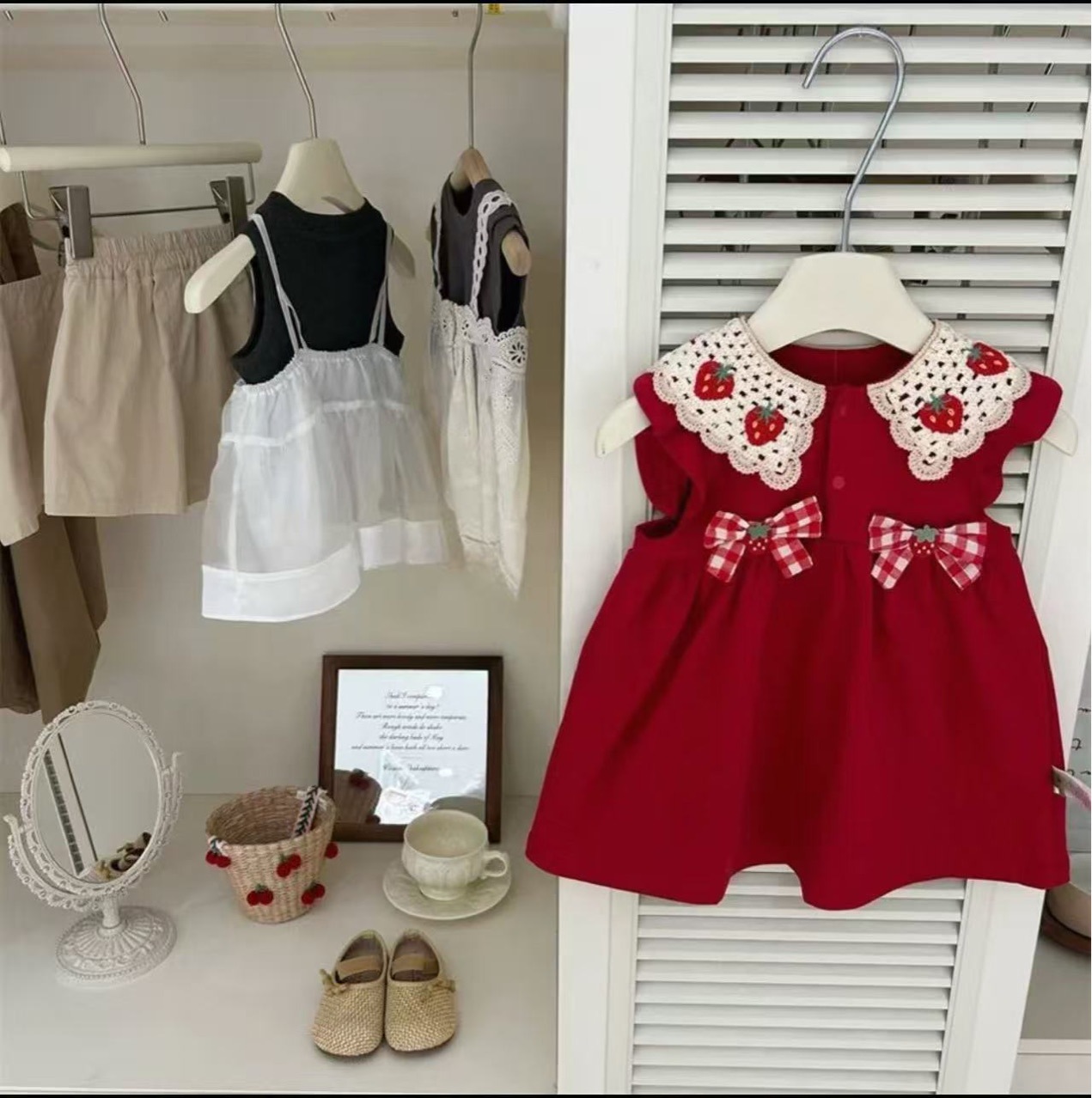 女宝宝礼服夏季包屁连衣裙蝴蝶结包臀裤甜美可爱红色草莓超萌背心