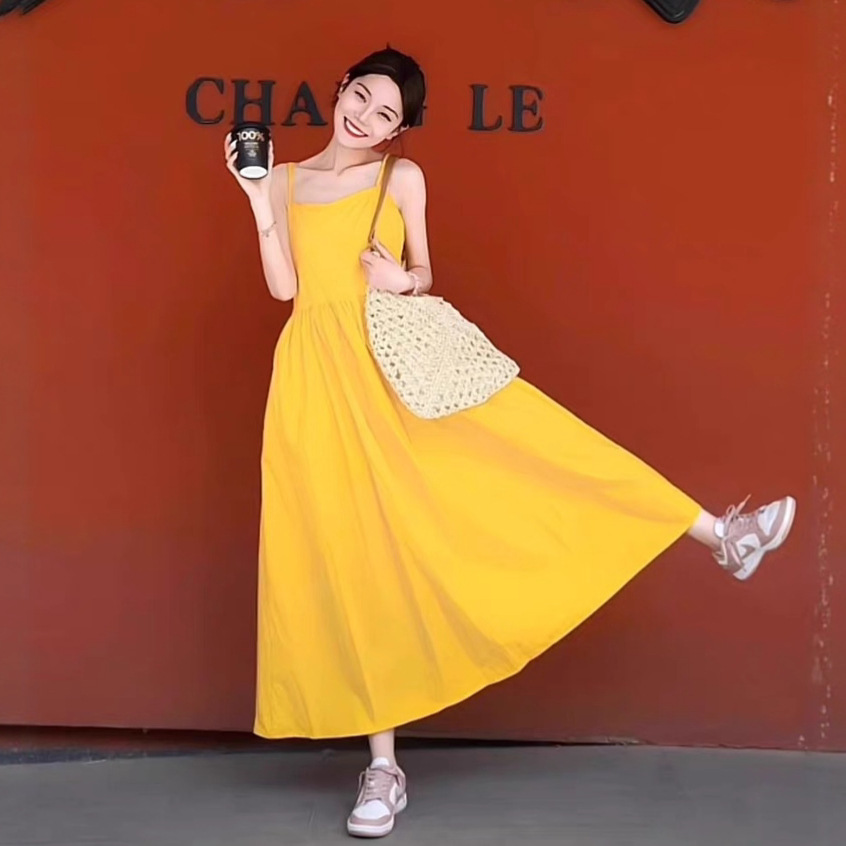 雲南大理洱海新疆海辺の休暇旅行着用写真撮影女性の夏のための見事な黄色のサスペンダードレス