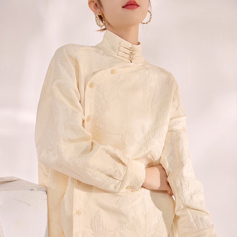 秋の高級ジャカード新中国式の斜め襟に合わせて、スタンドカラーのシャツの雰囲気があります。