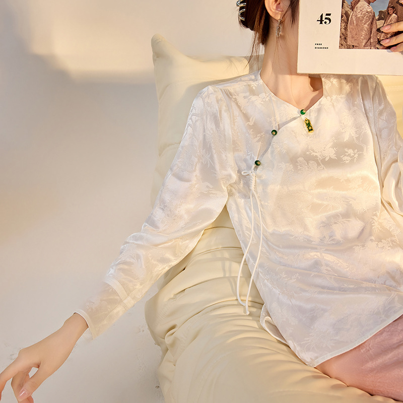 新中式サテンジャカードレーヨンシャツ、中国風ホワイト、万能で高級感のある上品なトップス ZXモデルM3078