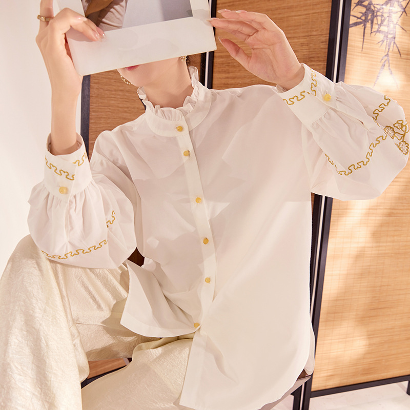 春の新作、中国風金糸刺繍高級シャツ、新中式長袖フリル襟トップス、女性用 ZXモデル MZ069