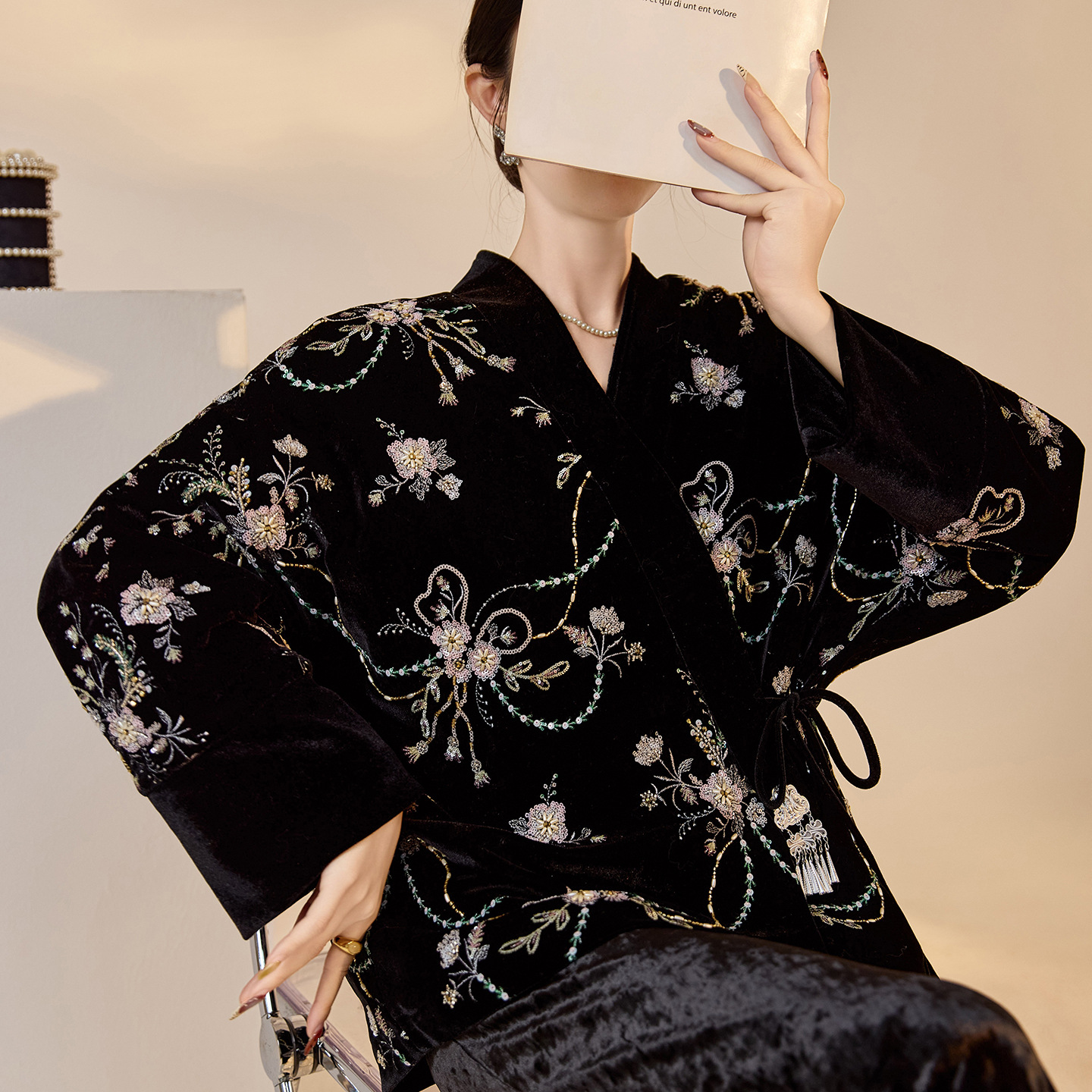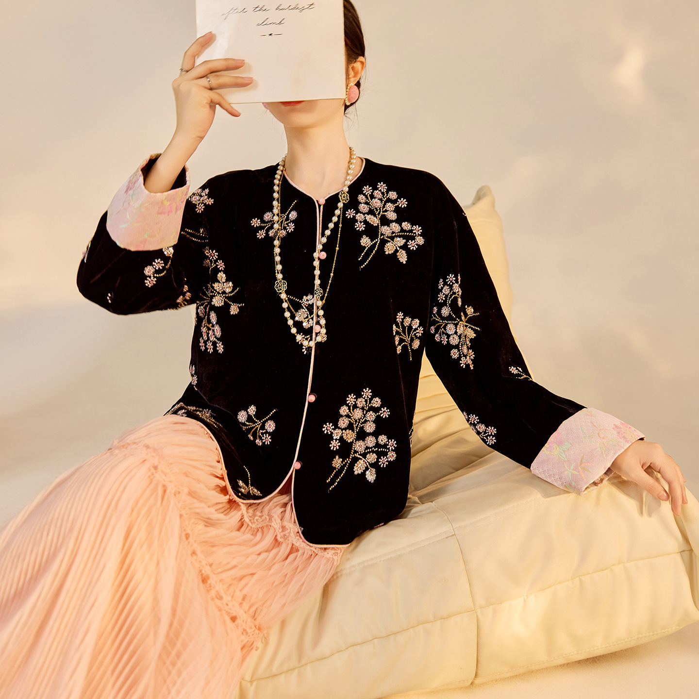 2025年冬 国風ベルベットボタン付きトップス 新中式花柄スパンコールレトロ風ジャケット 中綿入りM3016