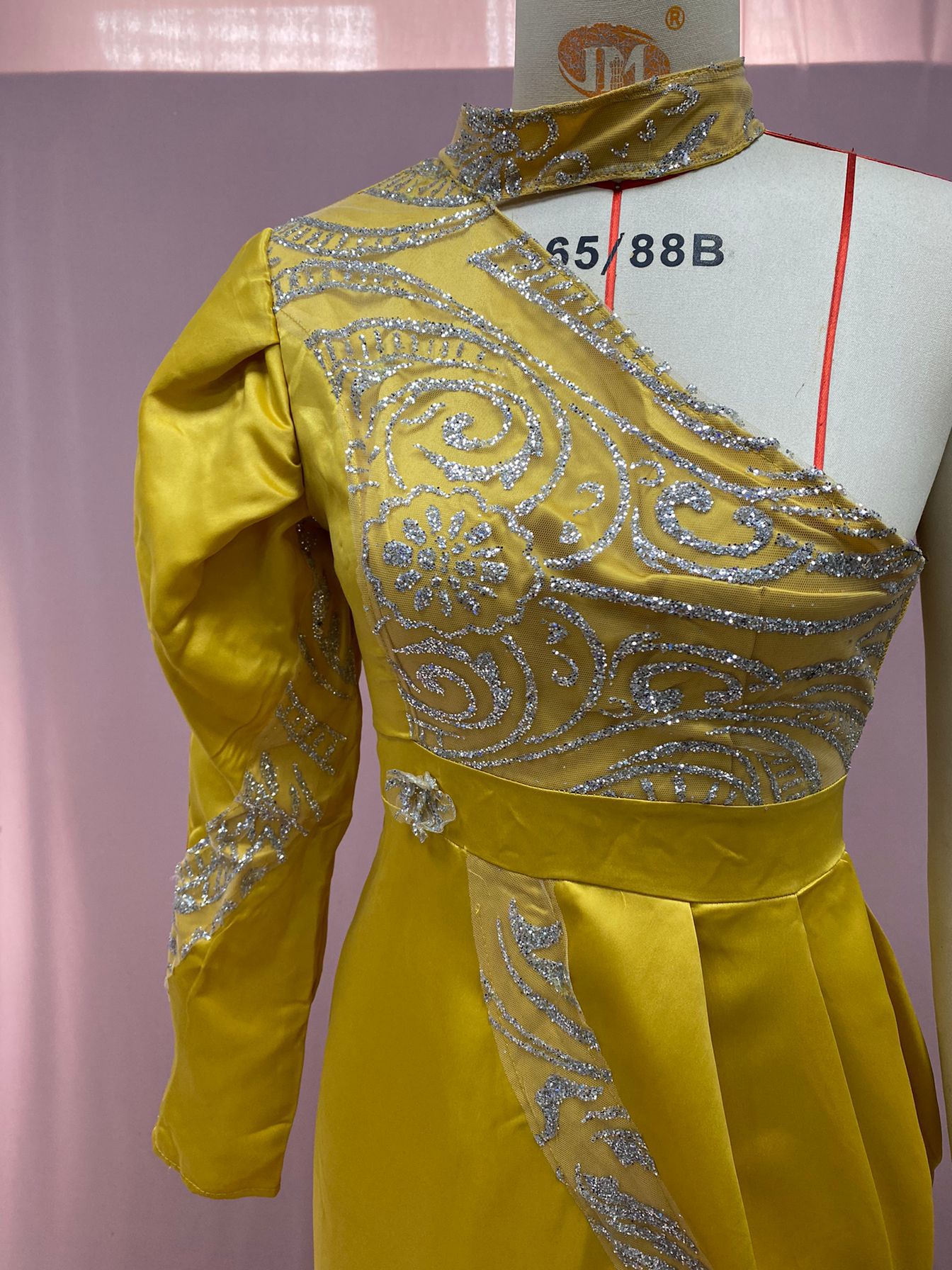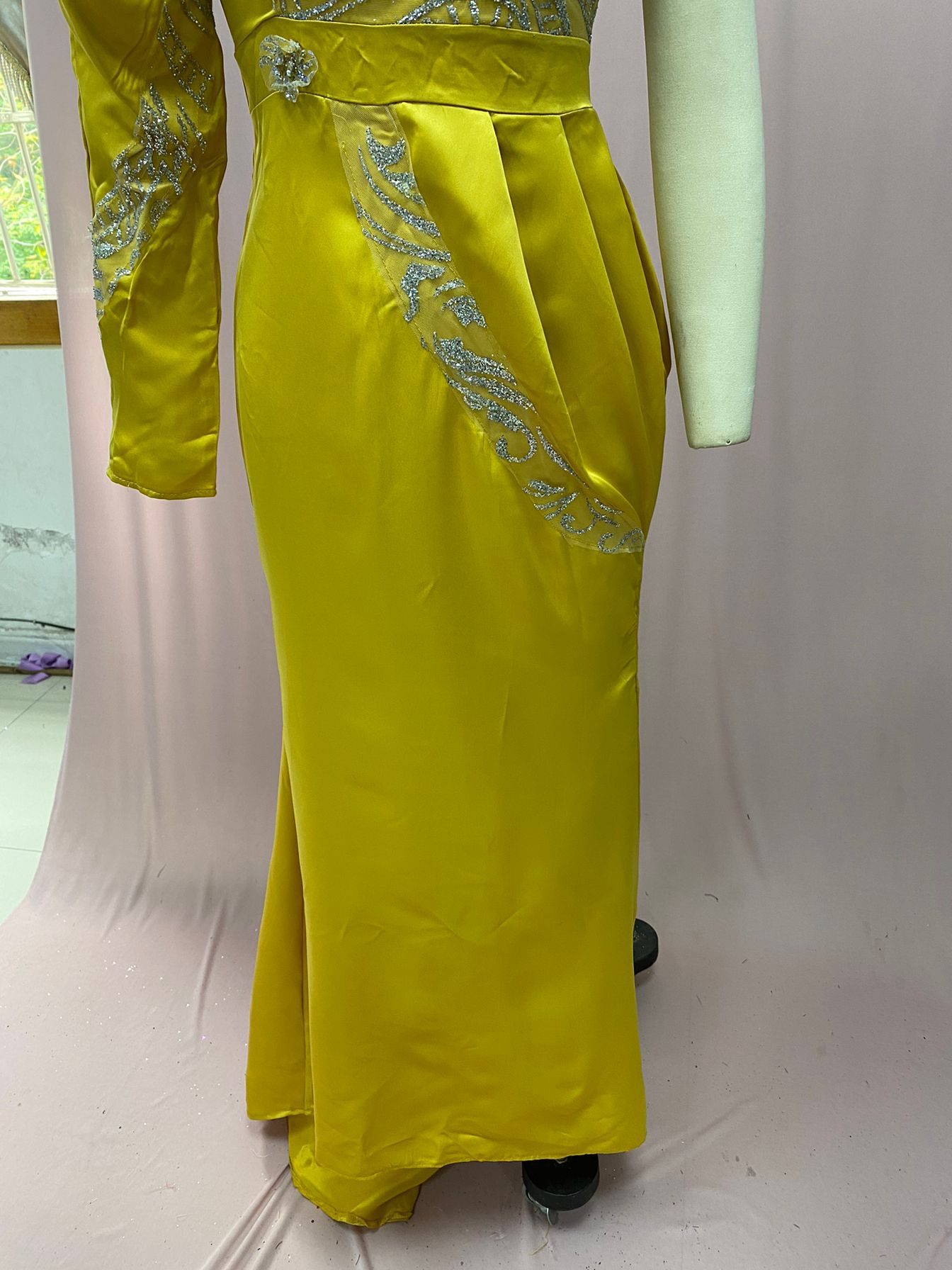 Ba7059明るい黄色の手縫いドリルは金のリボンのワンピースのムスリムの中東のモロッコの婦人服をつなぎ合わせます。