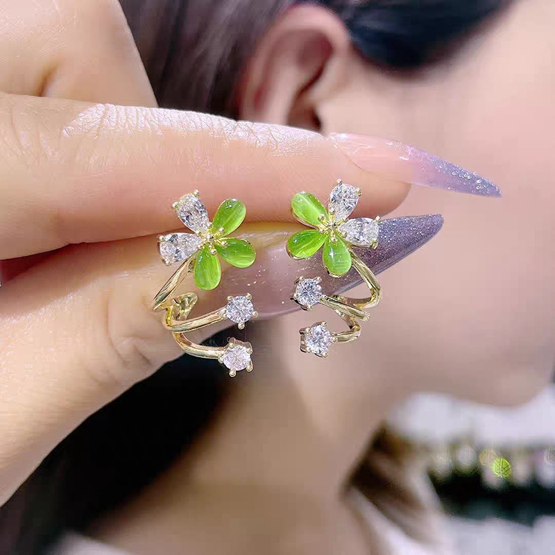 緑の猫の目の石はダイヤモンドの花のピアスを入れます。