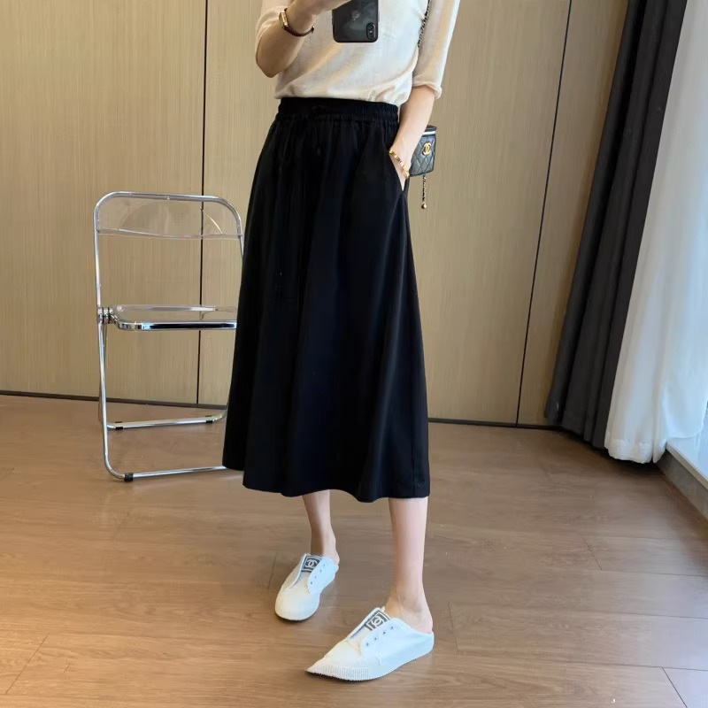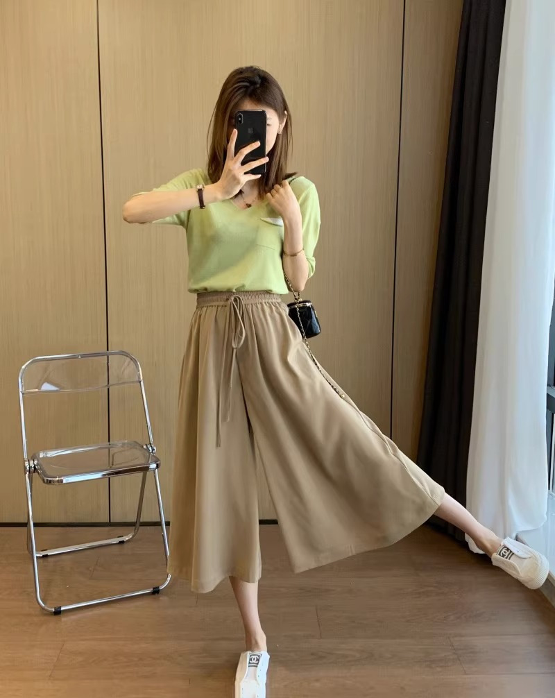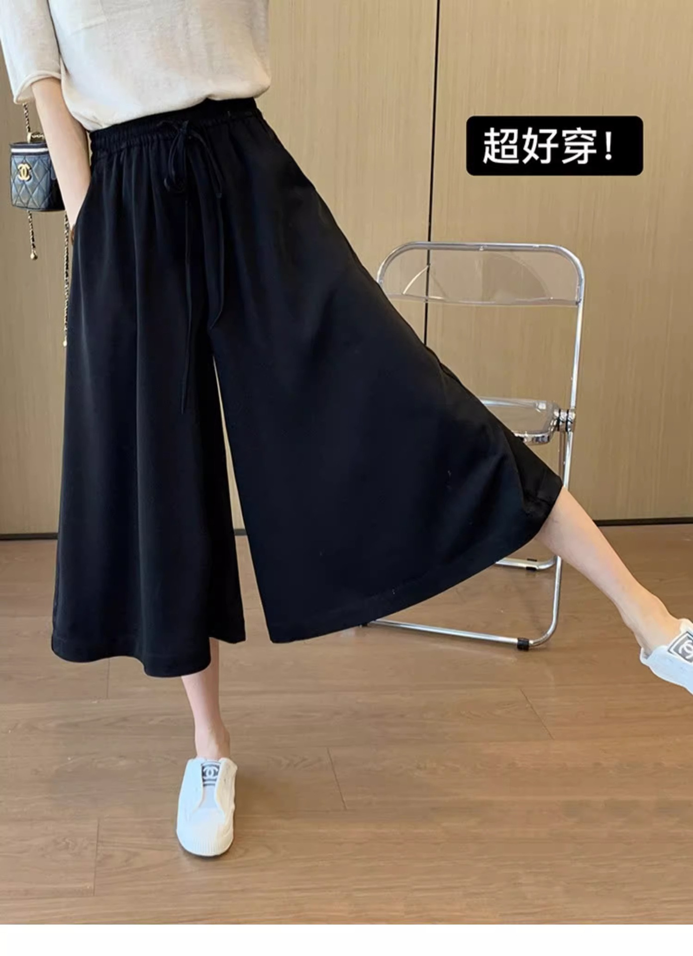 氷の糸の高腰のカジュアルな百合のワイドレギンスの女性の夏の薄いタイプのゆったりしていてやせている7分のズボンの2024はひものストレートのズボンを引きます。