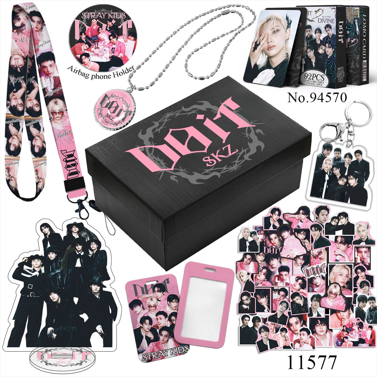礼盒包含:钥匙扣*6 立牌*2 手账胶带*2卷 挂绳 透卡一套(8张) lomo卡(55张) 贴纸一套(93张) 照片卡*2 共16件