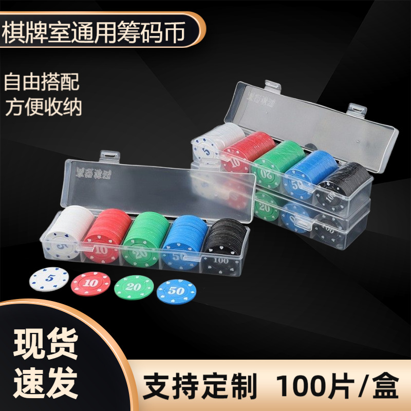 プラスチック製のチップコイン100枚の箱入りのチェスルームは百家楽麻雀機のポイントコインの徳州のトランプのチップを使います。