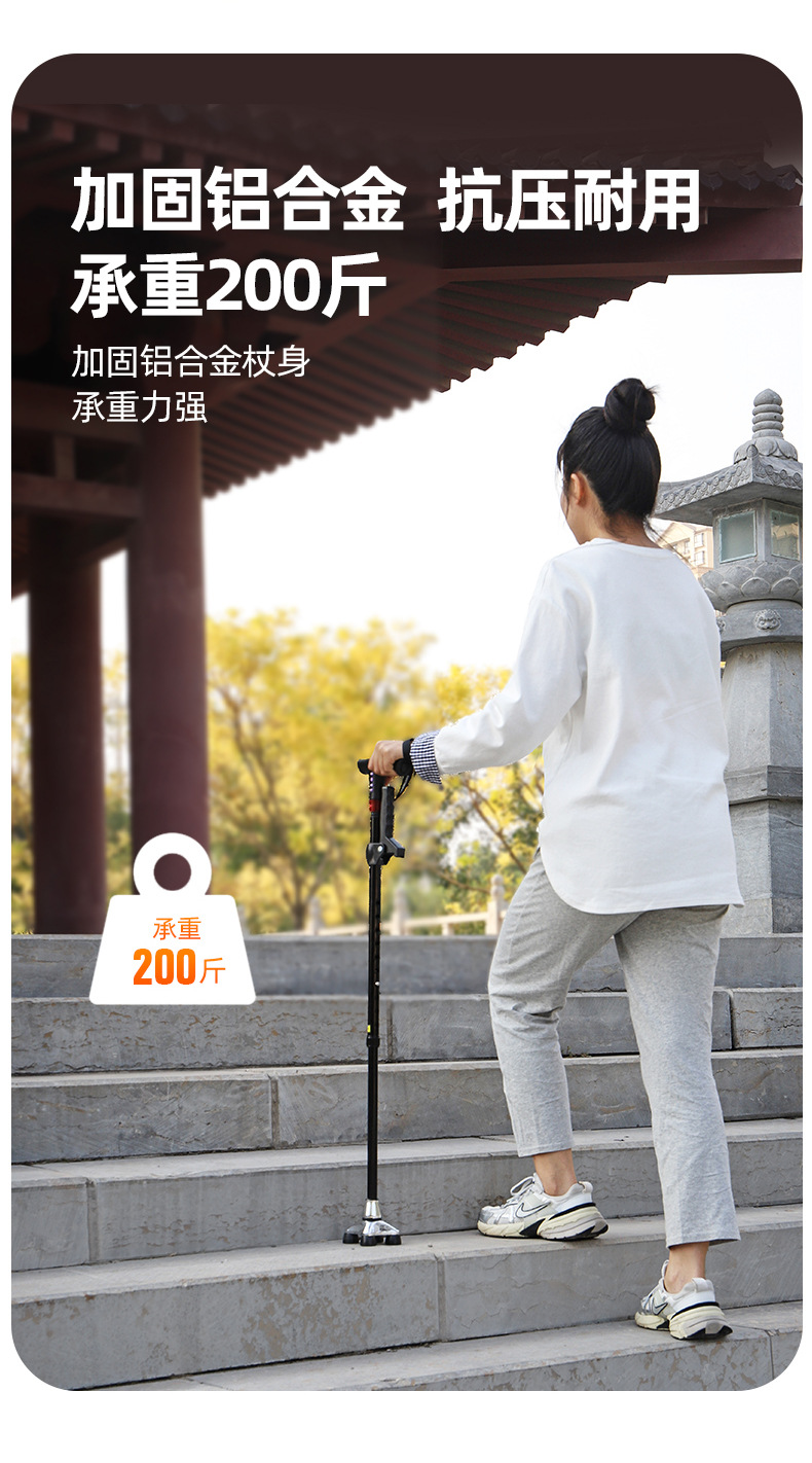 レフアルミ合金製四脚杖、高齢者用滑り止め伸縮式多機能杖、ライト付き四脚登山杖