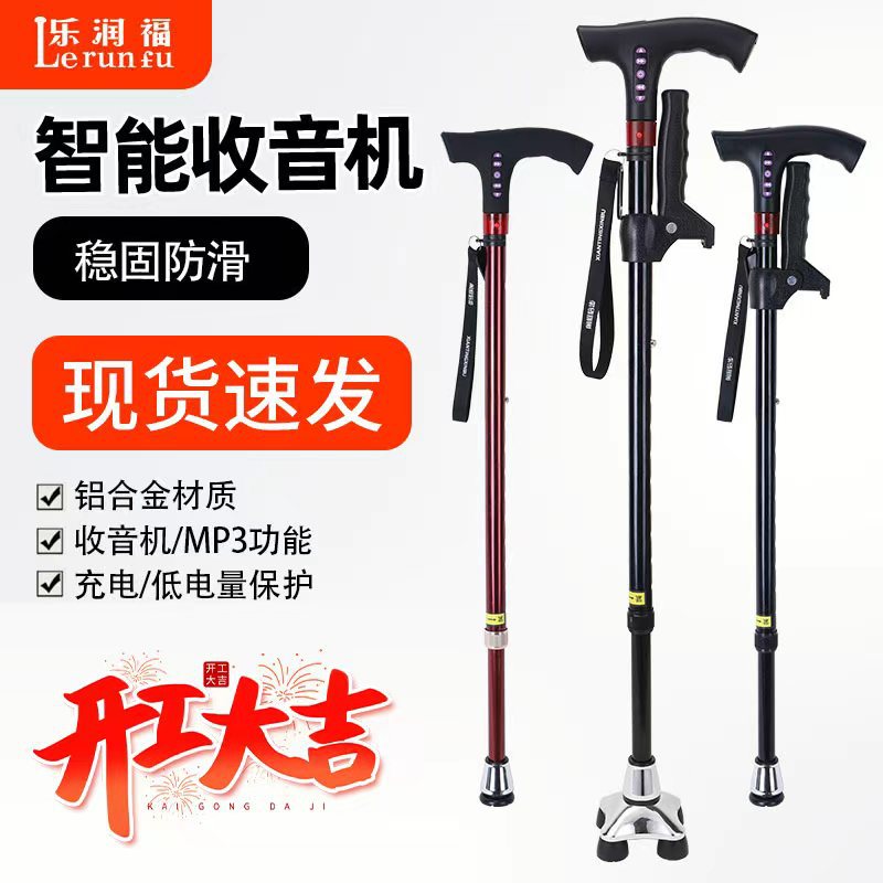 Lerunfu スマートラジオ軽量ステッキ高齢者用四本足滑り止めステッキ高齢者用特別な伸縮ステッキ