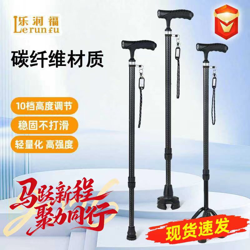 高齢者向けローフカーボンファイバー松葉杖、超軽量高齢者滑り止め四本足松葉杖、伸縮式カーボン杖、ライト付き